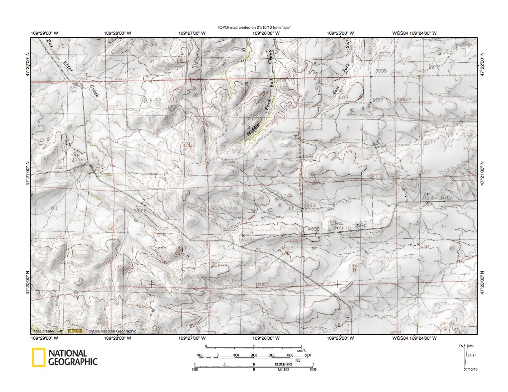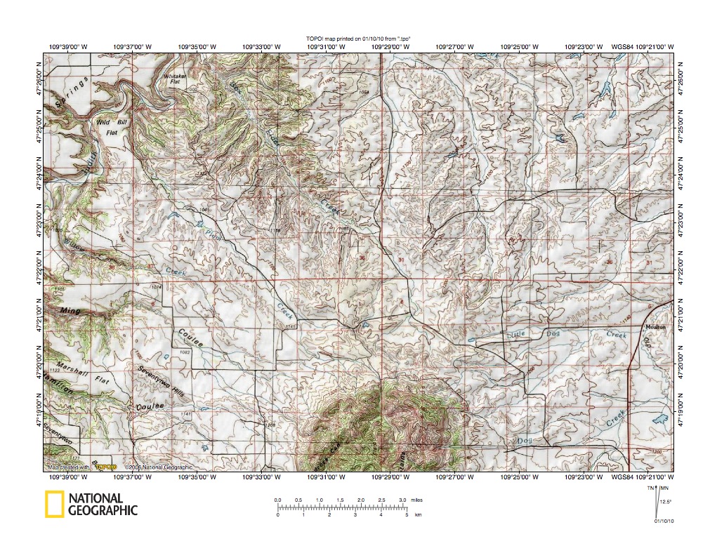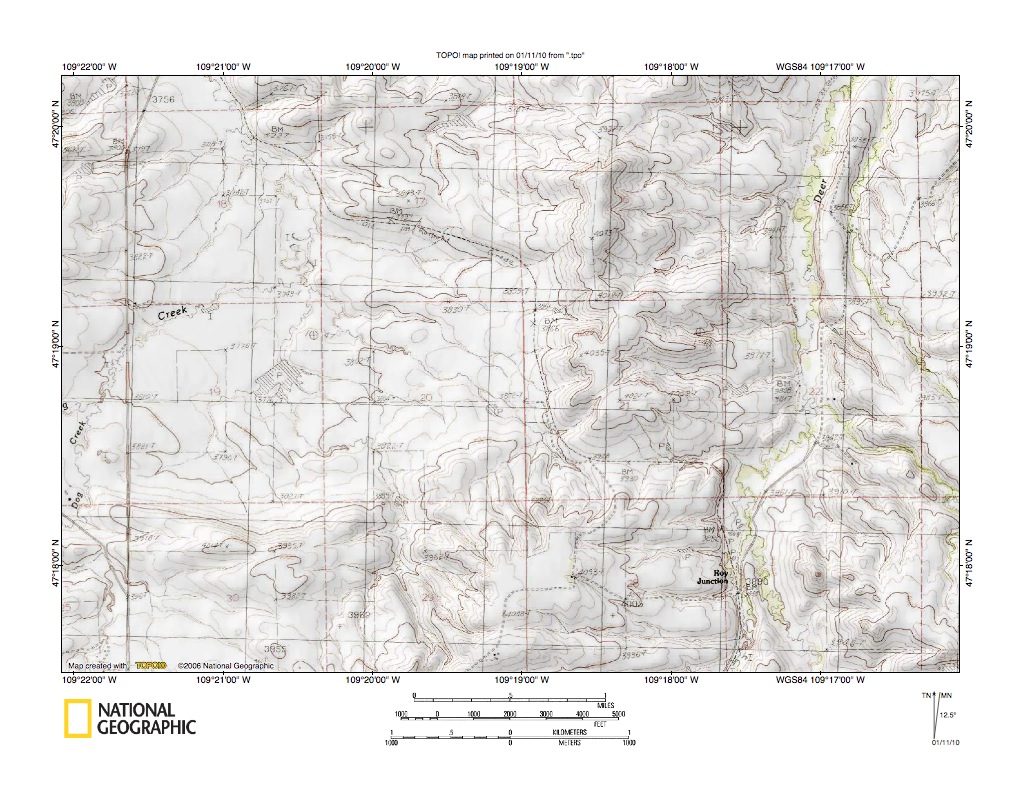 Figure 9: Dog Creek-Armells Creek drainage divide area. United States Geological Survey map digitally presented using National Geographic Society TOPO software.