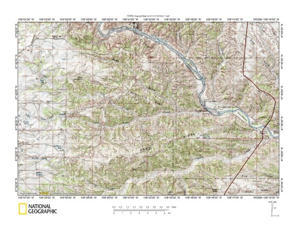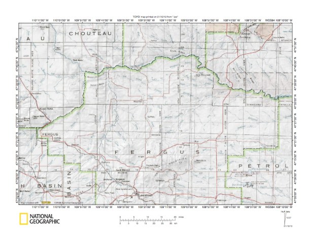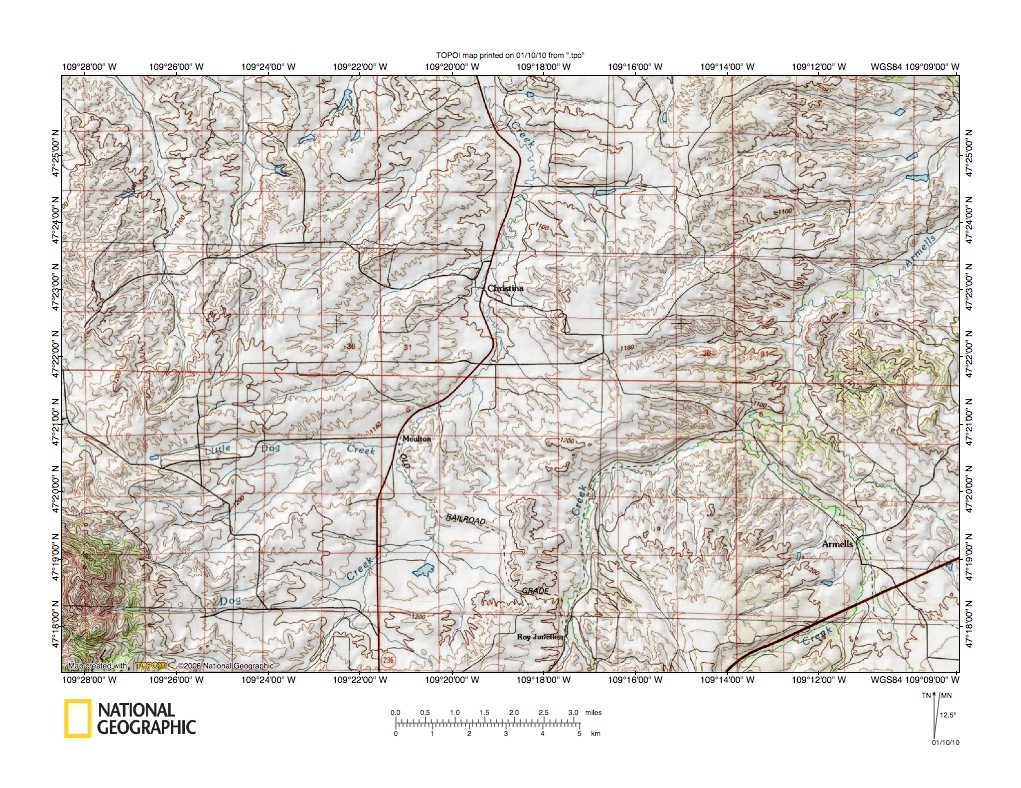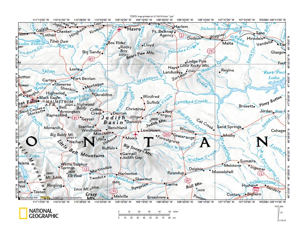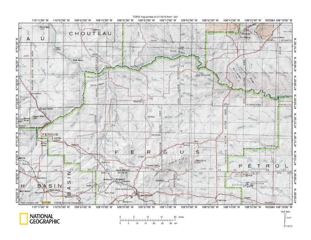 Figure 1: Judith River-Armells Creek drainage divide area location map (select and click on maps to enlarge). National Geographic Society map digitally presented using National Geographic Society TOPO software.
