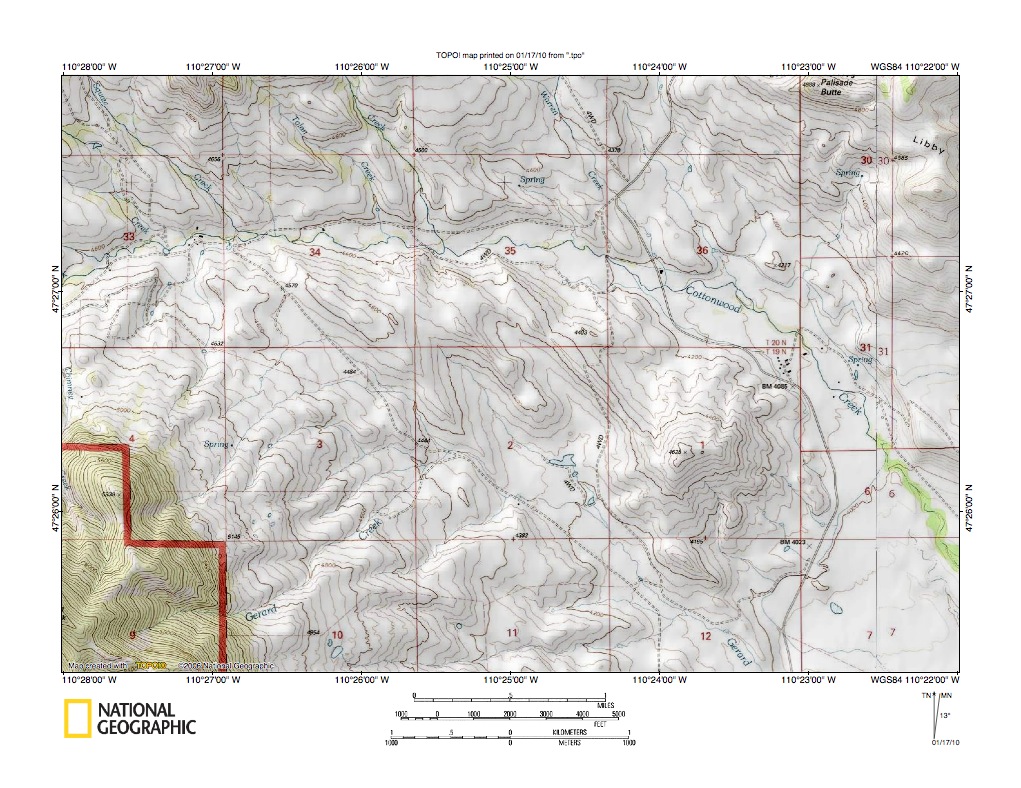 Figure 9: Cottonwood Creek-Gerard Creek drainage divide area. United States Geological Survey map digitally presented using National Geographic Society TOPO software.