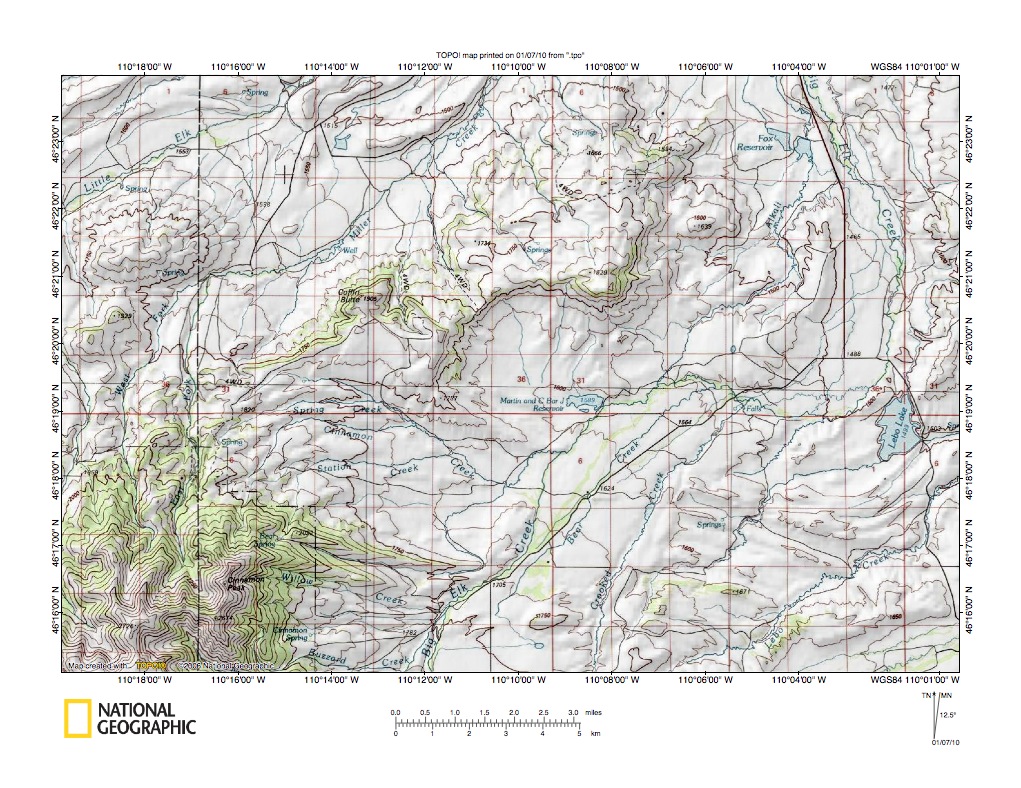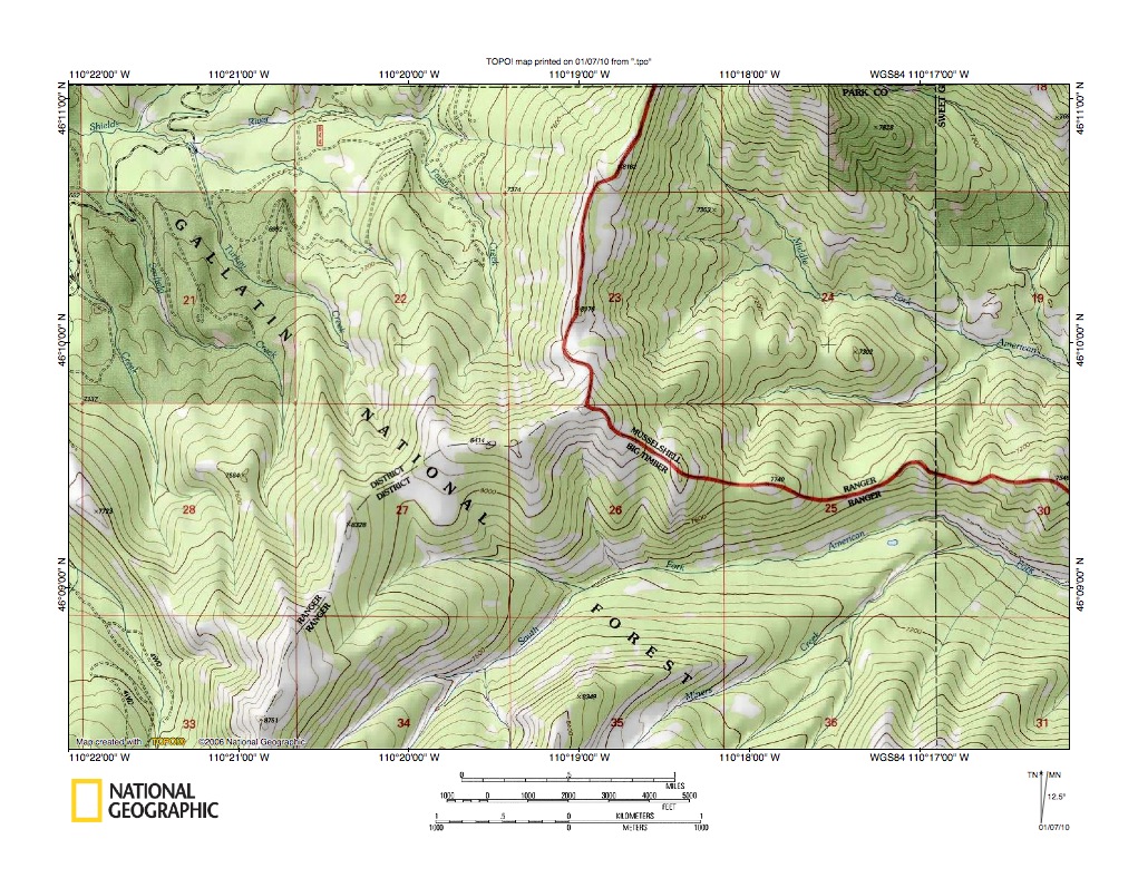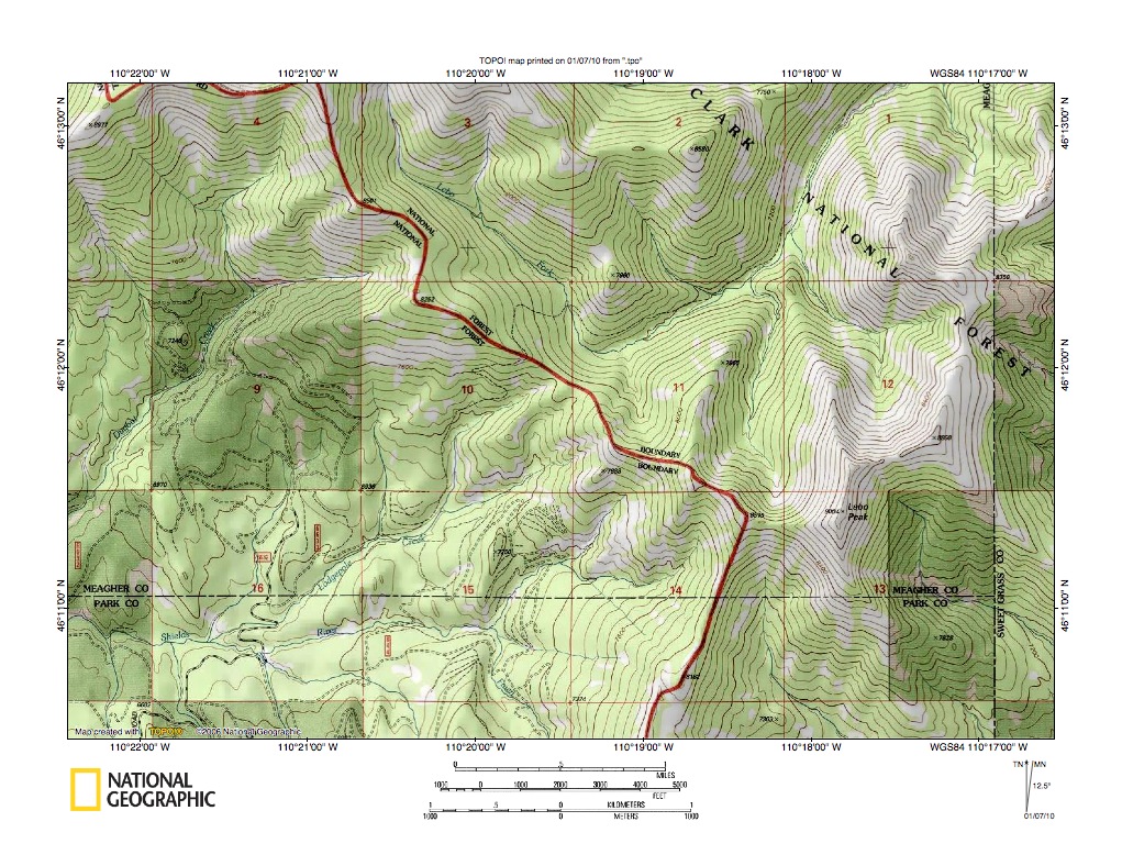 Figure 2: South Fork-American Fork Musselshell River drainage divide area detailed location map. United States Geological Survey map digitally presented using National Geographic Society TOPO software.