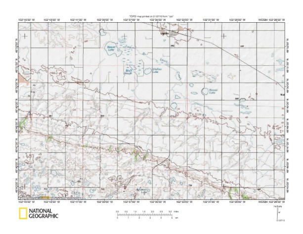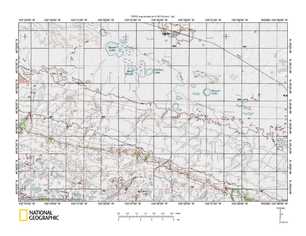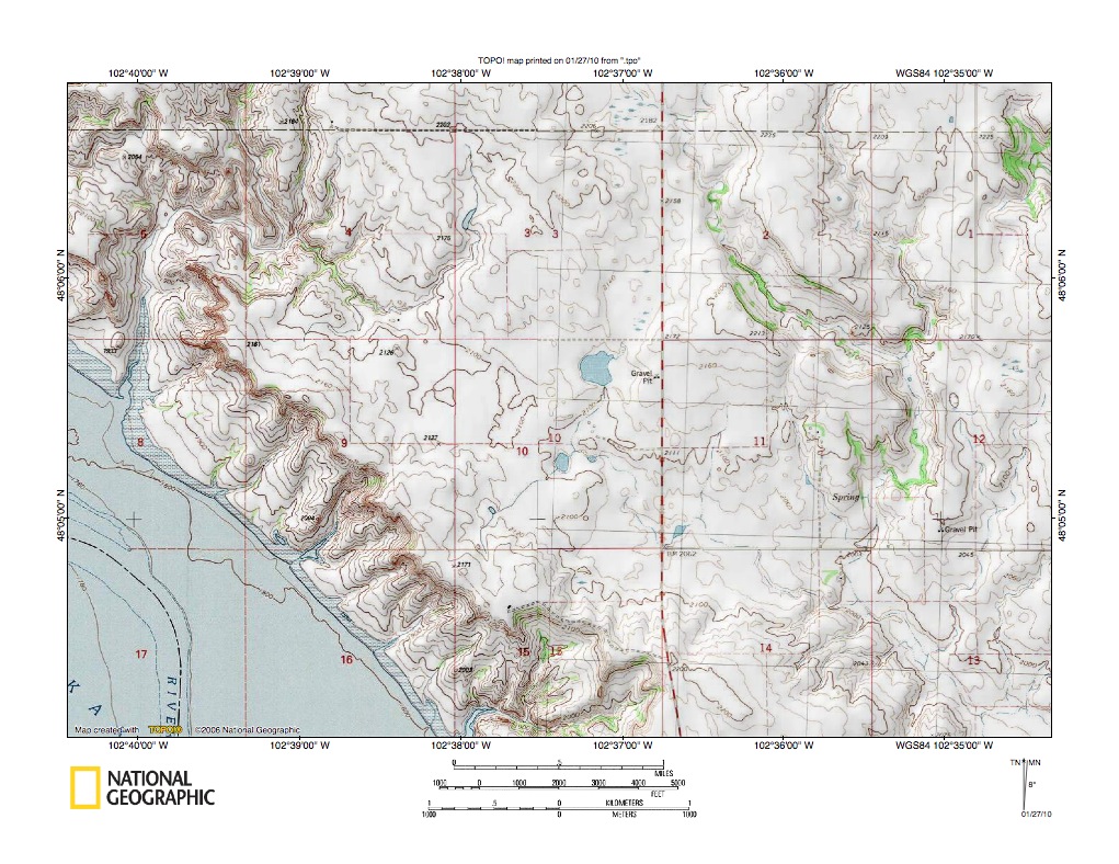 Figure 3: Missouri Escarpment and Missouri Coteau south of Lignite, North Dakota.United States Geological Survey map digitally presented using National Geographic Society TOPO software.
