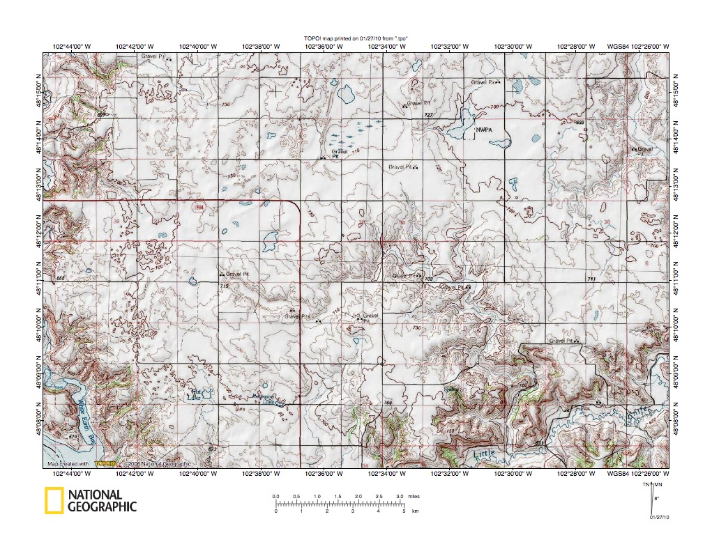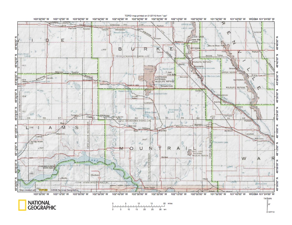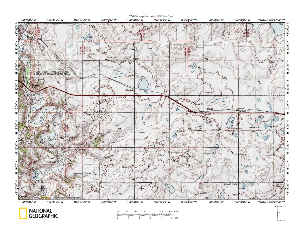 Figure 7: White Earth River-Little Knife River drainage area near Ross, North Dakota.United States Geological Survey map digitally presented using National Geographic Society TOPO software.