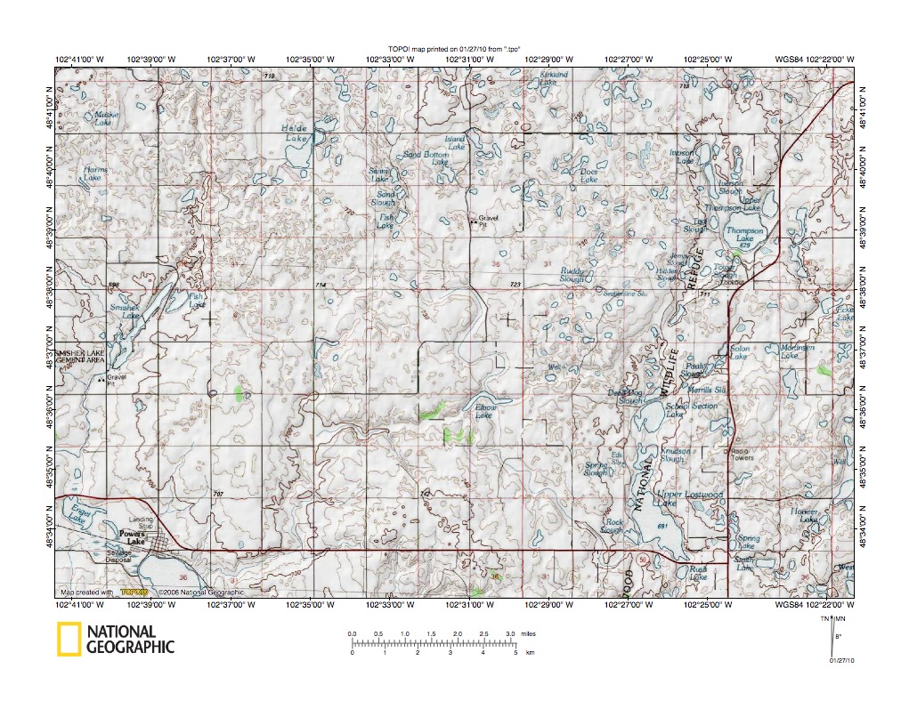 Figure 5: Smishek Lake and Lostwood Lakes area on Missouri Coteau.United States Geological Survey map digitally presented using National Geographic Society TOPO software.