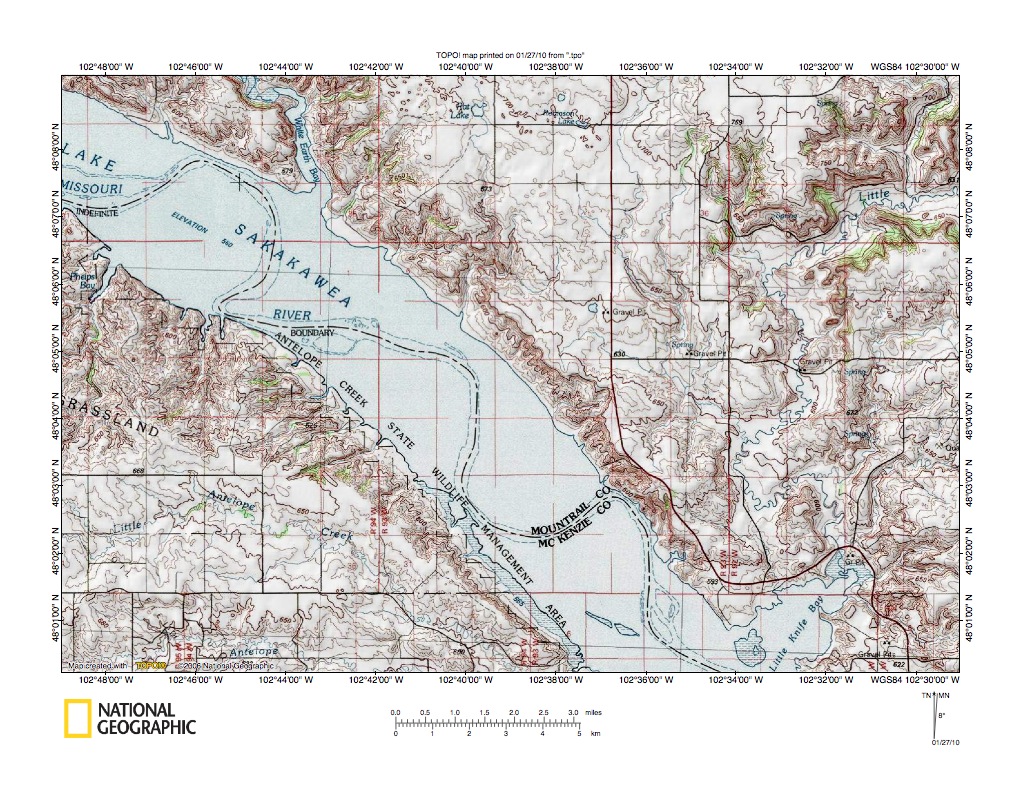 Figure 8: White Earth River-Little Knife River drainage divide area northeast of Missouri River.United States Geological Survey map digitally presented using National Geographic Society TOPO software.