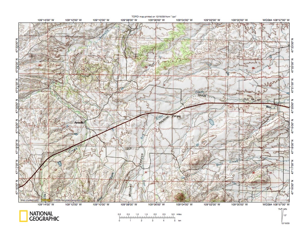 Figure 3: Armells Creek-Box Elder Creek drainage divide area north of Roy, Montana. United States Geological Survey map digitally presented using National Geographic Society TOPO software.