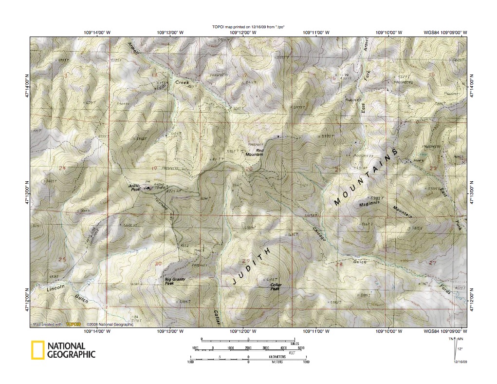 Figure 7: Armells Creek- Fords Creek drainage divide area near Judith Peak. United States Geological Survey map digitally presented using National Geographic Society TOPO software.