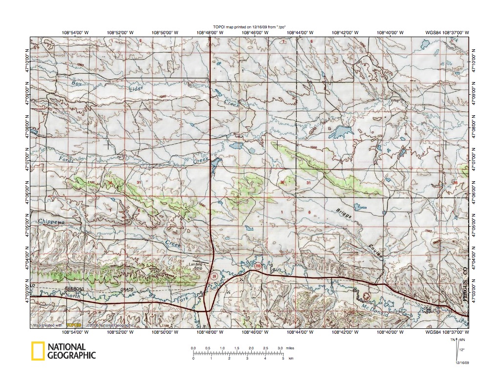 Figure 9: Little Box Elder Creek-McDonald Creek drainage divide north of Grassrange. United States Geological Survey map digitally presented using National Geographic Society TOPO software.