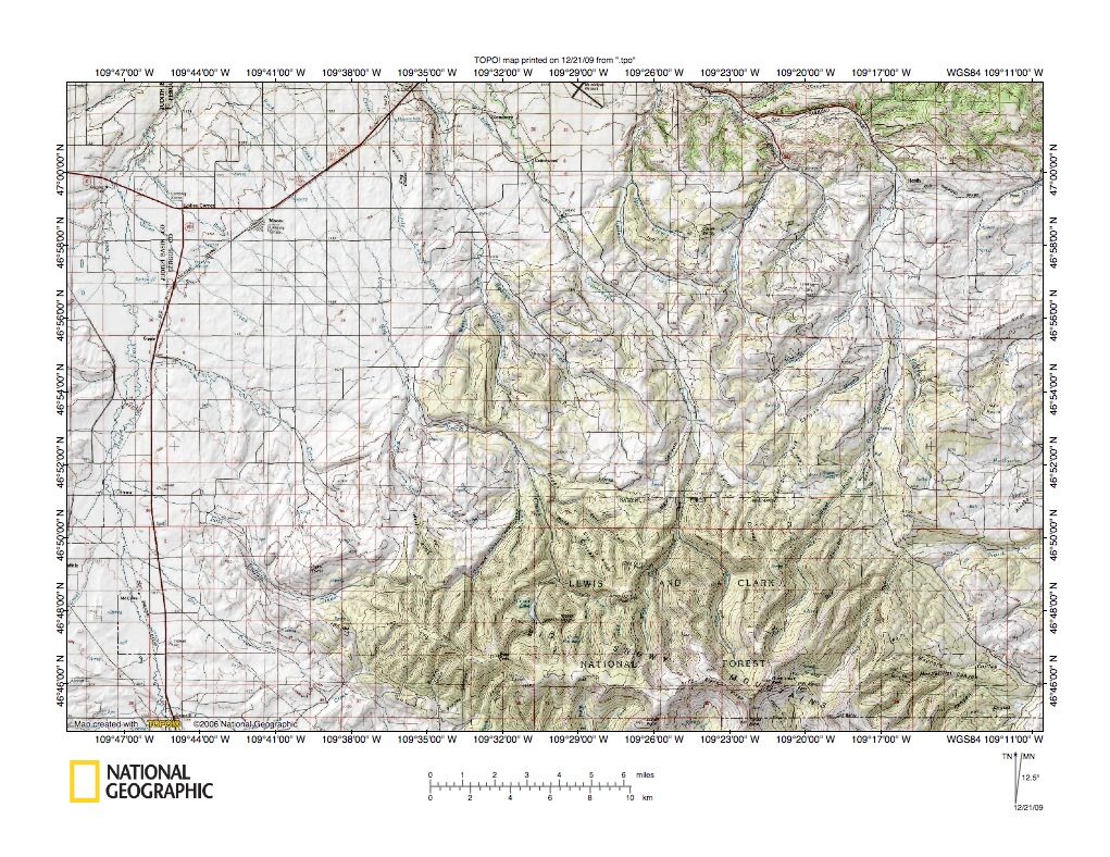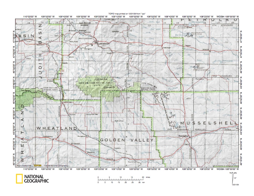 Figure 3: Area north and west of Big Snowy Mountains Judith River-Musselshell River drainage divide. United States Geological Survey map digitally presented using National Geographic Society TOPO software.