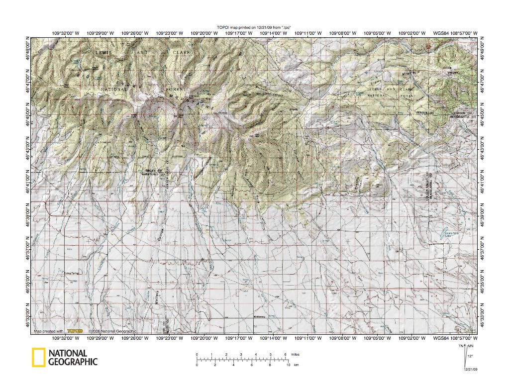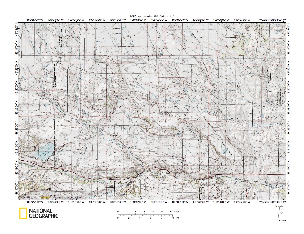 Figure 10: Judith River-Musselshell River drainage divide area at Judith Gap. United States Geological Survey map digitally presented using National Geographic Society TOPO software.