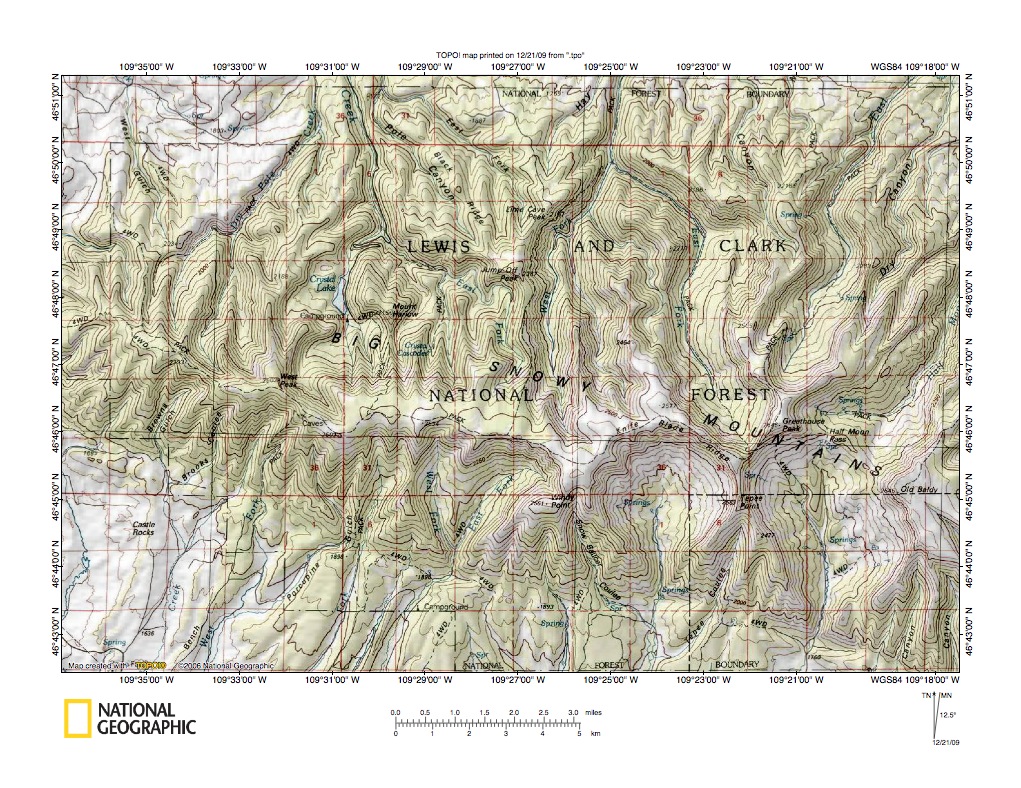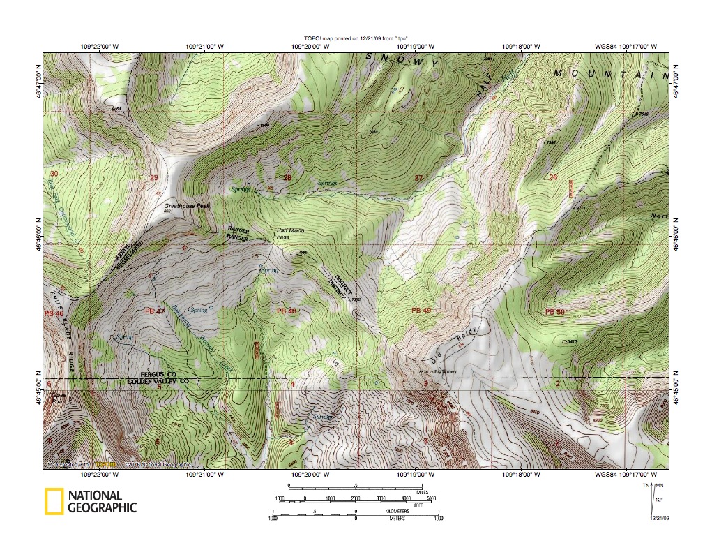 Figure 7: Big Snowy Mountains Judith River-Musselshell River drainage divide area near Half Moon Pass. United States Geological Survey map digitally presented using National Geographic Society TOPO software.