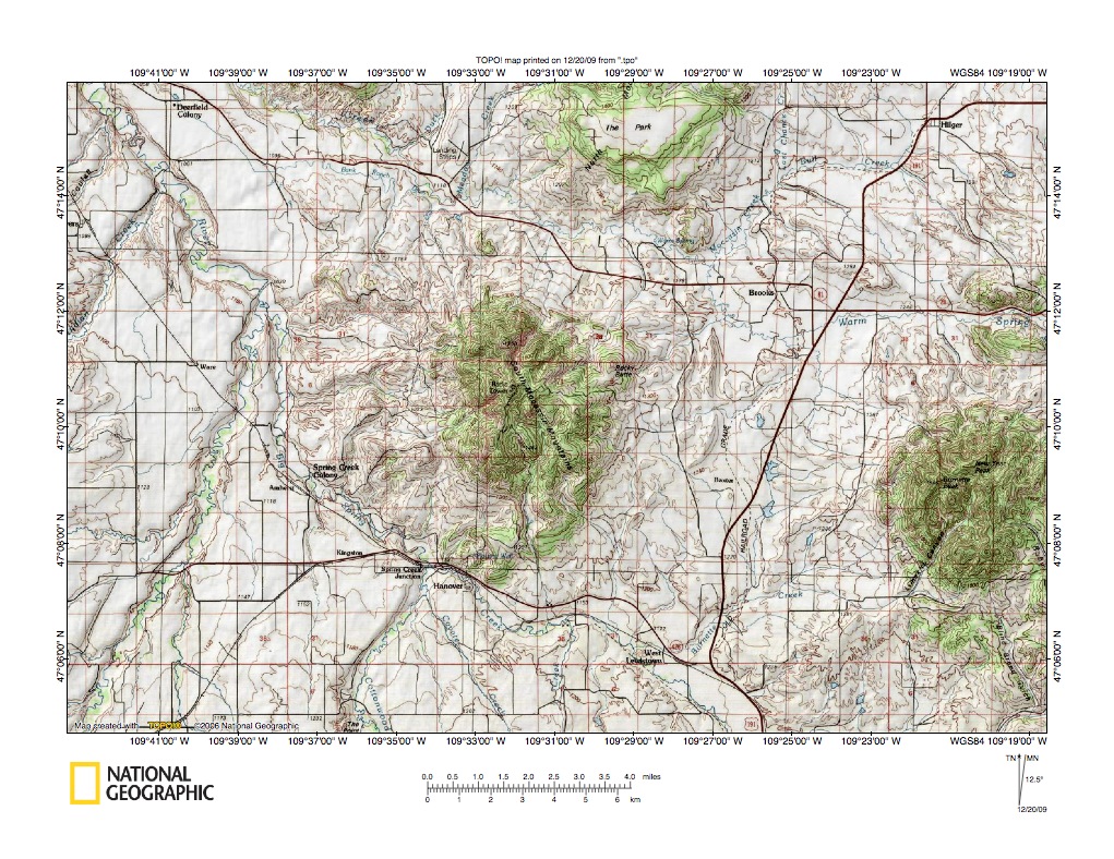 - Figure 5 illustrates the Warm Spring Creek-Big Spring Creek drainage divide area west of the Judith Mountain and west of the figure 3 map area. Figure 5 includes overlap areas with figure 3. The southwest end of the Judith Mountains is located along the figure 5 east edge (south half). The South Moccasin Mountains are located in the figure 5 center and the North Moccasin Mountains are located in the figure 5 north center edge area. The Judith River flows north-northeast from the figure 5 southwest corner and then turns to flow north-northwest to the figure 5 northwest corner. Big Springs Creek flows from the figure 5 south edge along the South Moccasin Mountains southwest flank and joins the Judith River in the figure 5 west center area. Warm Spring Creek flows west from Judith Mountains and then northwest between the South and North Moccasin Mountains to join the Judith River just northwest of the figure 5 northwest corner. Note the large north-south through valley between the South Moccasin Mountains and the Judith Mountains, which links the present day west and northwest-oriented Warm Spring Creek valley with the northwest-oriented Big Spring Creek valley. Also note the Warm Spring Creek valley eroded between the South Moccasin Mountains and the North Moccasin Mountains. Today that valley is used by northwest-oriented Warm Spring Creek, but it was eroded by southeast-oriented flood flow moving to join an immense flood of southeast-oriented water moving along the Big Spring Creek alignment to a large west-east oriented through valley between the Judith Mountains and the Big Snowy Mountains (illustrated in figure 6 below) and probably to what was then the newly eroded deep Yellowstone River valley, until headward erosion of the north-oriented Musselshell River valley captured the flood flow and diverted the flood waters north. The north-south valley between the South Moccasin Mountains and Judith Mountains was also eroded by southeast-oriented flood flow moving to the large west to east oriented through valley between the Judith Mountains and the Big Snowy Mountains. In the figure 5 northeast quadrant is a southwest-northeast oriented through valley linking the west- and northwest-oriented Warm Spring Creek valley with the northeast-oriented Armells Creek valley (Hilger is on the drainage divide and Armels Creek is not shown in figure 5). That southwest-northeast oriented through valley probably also moved large volumes of flood waters southwest along the Judith Mountains northwest flank to the north-south through valley and then east around the Judith Mountains south end.