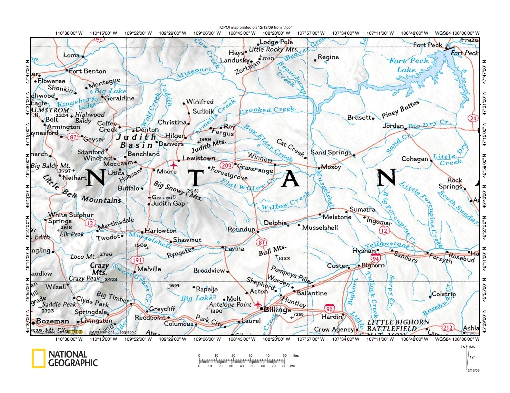 - Figure 2 illustrates a somewhat more detailed map of the Judith River-Musselshell River drainage divide areas discussed here. Judith Basin and Fergus Counties are located in Montana. The east-oriented Missouri River is located north of the figure 2 map area. The Judith River flows northeast from the figure 2 southwest corner area through Utica, Hobson, and then flows near Ross Fork and Ware, before turning northwest and north-northeast to flow to the figure 2 north edge. The north-oriented Musselshell River is located east of the figure 2 map area. The Judith Mountains are located northeast of Lewistown. The South Moccasin Mountains are located northwest of Lewistown and the unlabeled North Moccasin Mountains are located near the “E” in FERGUS. The Big Snowy Mountains are located near the figure 2 south center edge and the Little Snowy Mountains are located east of the Big Snowy Mountains. Warm Spring Creek is an important Judith River tributary mentioned here and originates in the Judith Mountains and flows west and northwest to join the north-northeast oriented Judith River near the figure 2 north edge. The East Fork Big Spring Creek is another important Judith River tributary and originates in the Big Snowy Mountains (located near the figure 2 south center edge) and flows north to Heath. From Heath Big Spring Creek flows through Lewistown and Kingston to join the north-northwest and north-northeast oriented Judith River just west of the Moccasin Mountains. Cottonwood Creek is an important Big Spring Creek tributary, which also originates in the high Big Snowy Mountains, and which flows northwest to join Big Spring Creek near Hanover. The North Fork McDonald Creek is an important Musselshell River tributary and originates east of Heath and flows east to Forestgrove and then east-northeast to Grassrange before flowing to the figure 2 east edge. Flatwillow Creek and its tributary, Half Moon Creek, are north-oriented Musselshell River tributaries also mentioned in this essay. Half Moon Creek originates near the East Fork Big Spring Creek source area in the high Big Snowy Mountains and flows northeast to join the east-oriented North Fork Flatwillow Creek, which turns southeast to the flow to the figure 2 southeast corner. East of the figure 2 map area Flatwillow Creek turns to flow northeast and join east-oriented McDonald Creek. Evidence in detailed maps below illustrates flood waters originally flowed on a topographic surface at least as high as the highest Judith Mountains elevations today. Flood waters of concern in this essay originally were moving to what was then a newly eroded and deep northeast-oriented Yellowstone River valley (see figure 1). Headward erosion of the deep north-oriented Musselshell River valley at some point captured the southeast-oriented flood flow routes and diverted the flood waters north, although flood waters moving across the figure 2 map area continued to flow to the same southeast-oriented flood flow channels. As flood waters flowed across the figure 2 map area the Big Snowy Mountains, Little Snowy Mountains, Judith Mountains, South Moccasin Mountains, and North Moccasin Mountains emerged as major obstacles, which forced flood flow to move around them. Emergence of these isolated mountain areas could have occurred as flood waters deeply eroded the region and/or could have occurred because the isolated mountain areas were uplifted as flood waters deeply eroded the region.