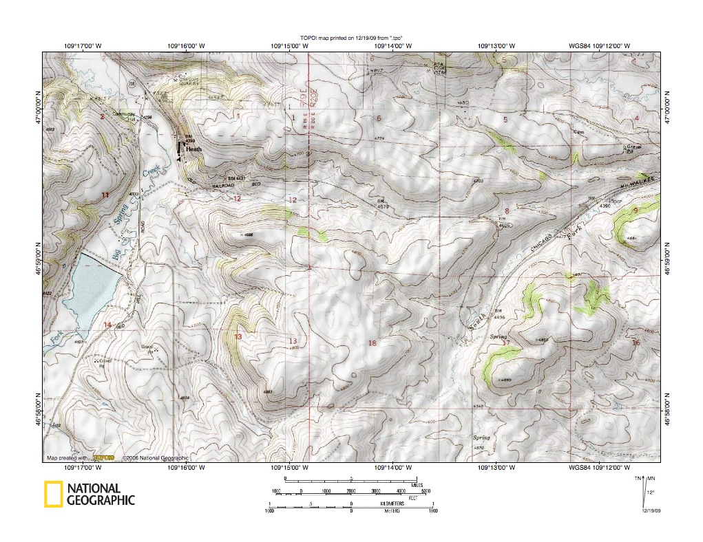 Detailed map of Big Spring Creek-South Fork McDonald Creek drainage divide area near Heath