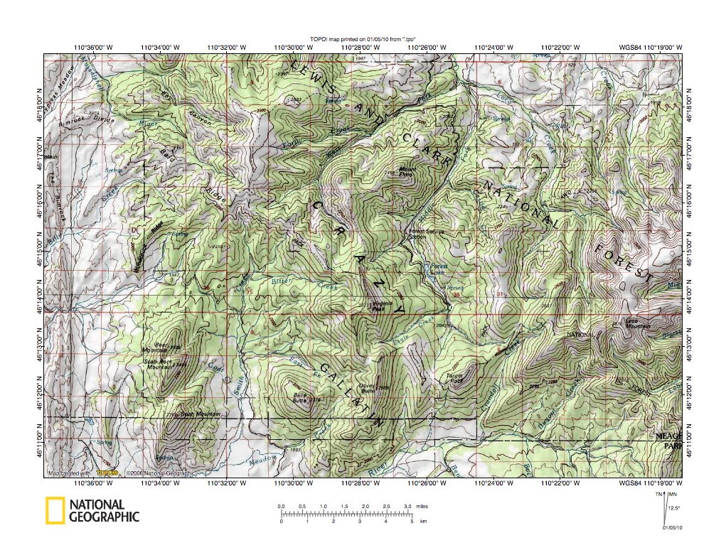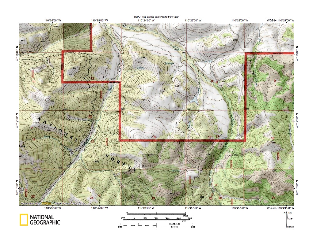 Figure 6: Bozeman Fork Musselshell River-West Fork Cottonwood Creek drainage divide area. United States Geological Survey map digitally presented using National Geographic Society TOPO software.