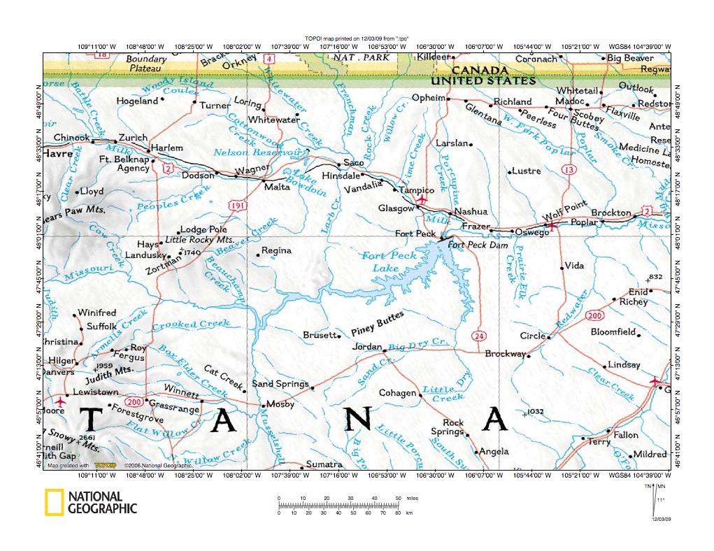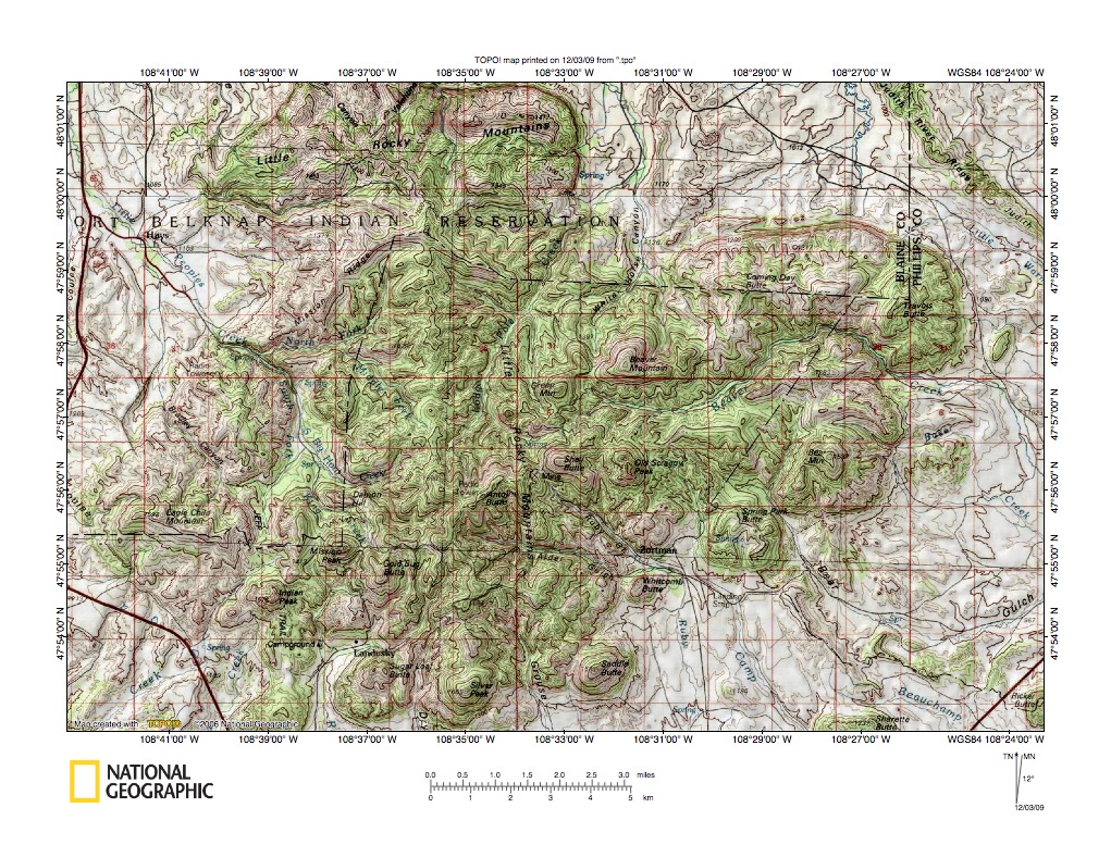 Figure 8: Drainage divides in Little Rockies Mountain area. United States Geological Survey map digitally presented using National Geographic Society TOPO software.