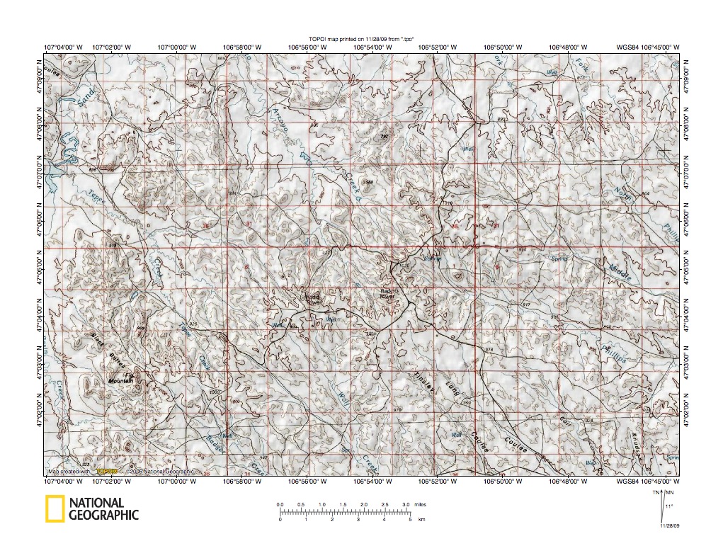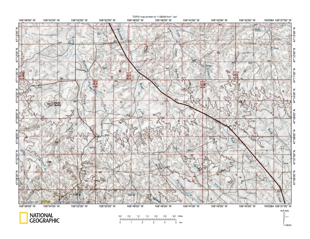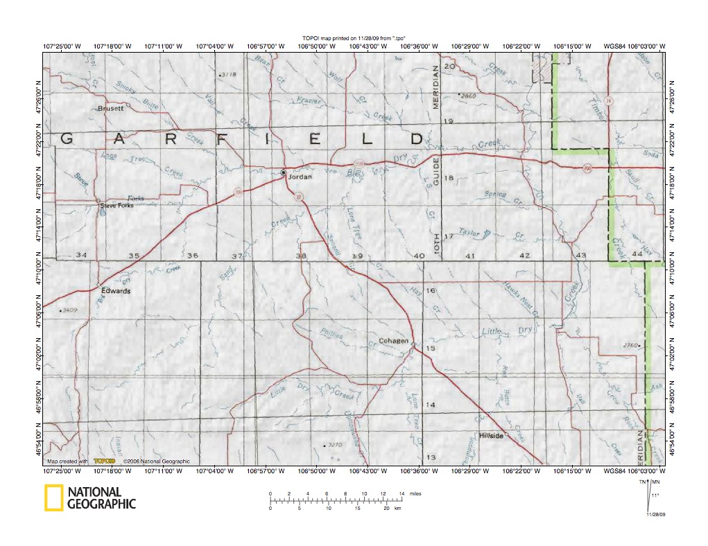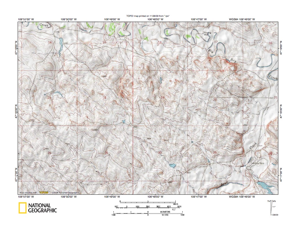 Figure 3: Big Dry Creek-Sand Creek drainage divide area near Jordan, Montana. United States Geological Survey map digitally presented using National Geographic Society TOPO software.