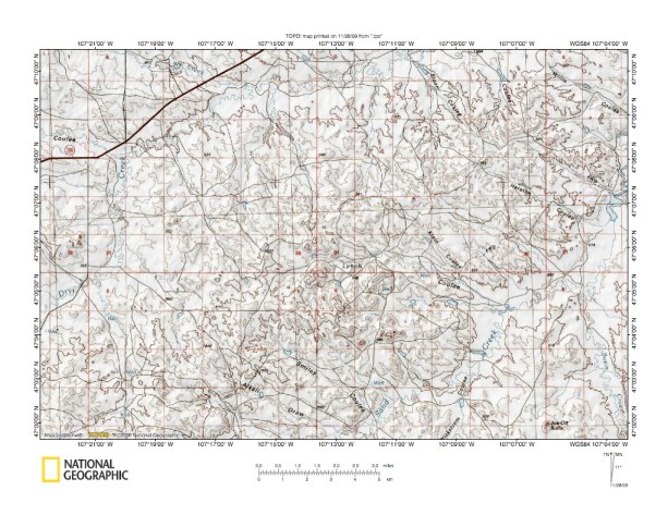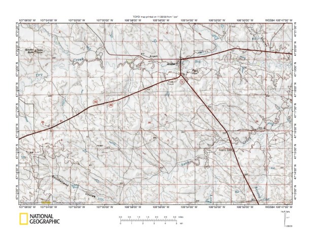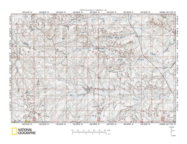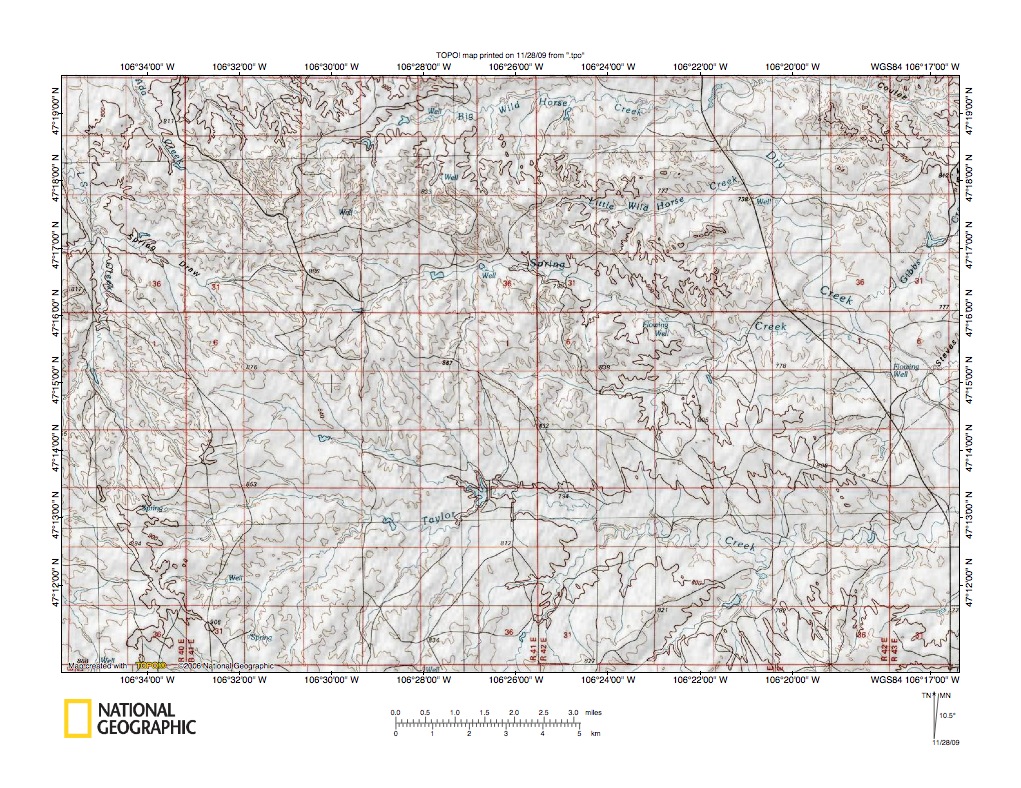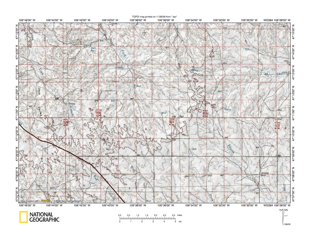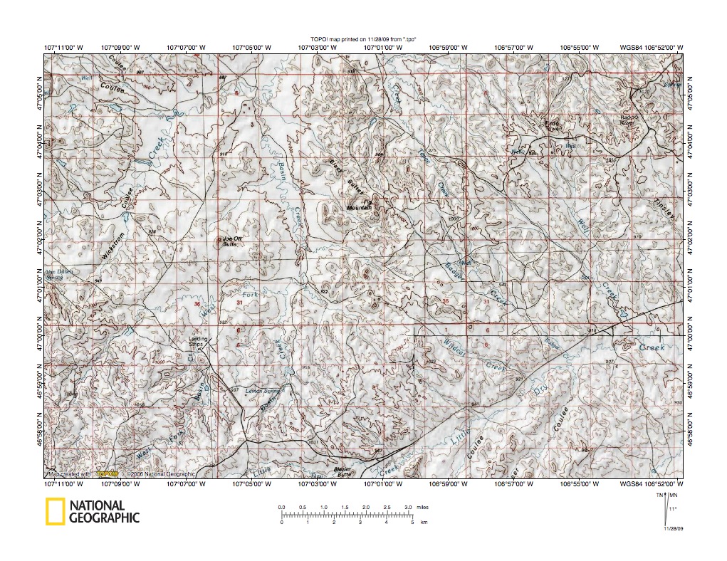 Figure 3: Big Dry Creek-Sand Creek drainage divide area near Jordan, Montana. United States Geological Survey map digitally presented using National Geographic Society TOPO software.