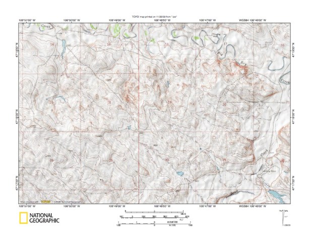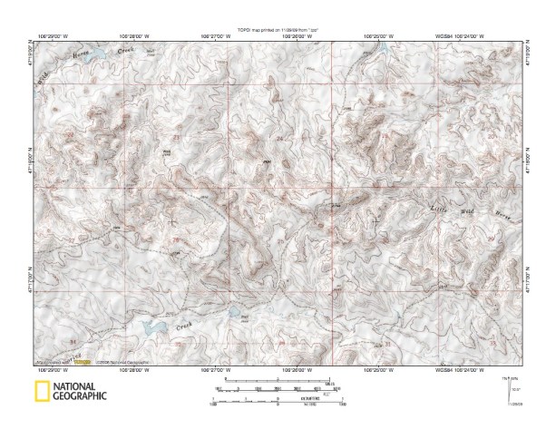 Figure 5a: Detailed map of Big Wild Horse Creek-Spring Creek drainage divide area. United States Geological Survey map digitally presented using National Geographic Society TOPO software.