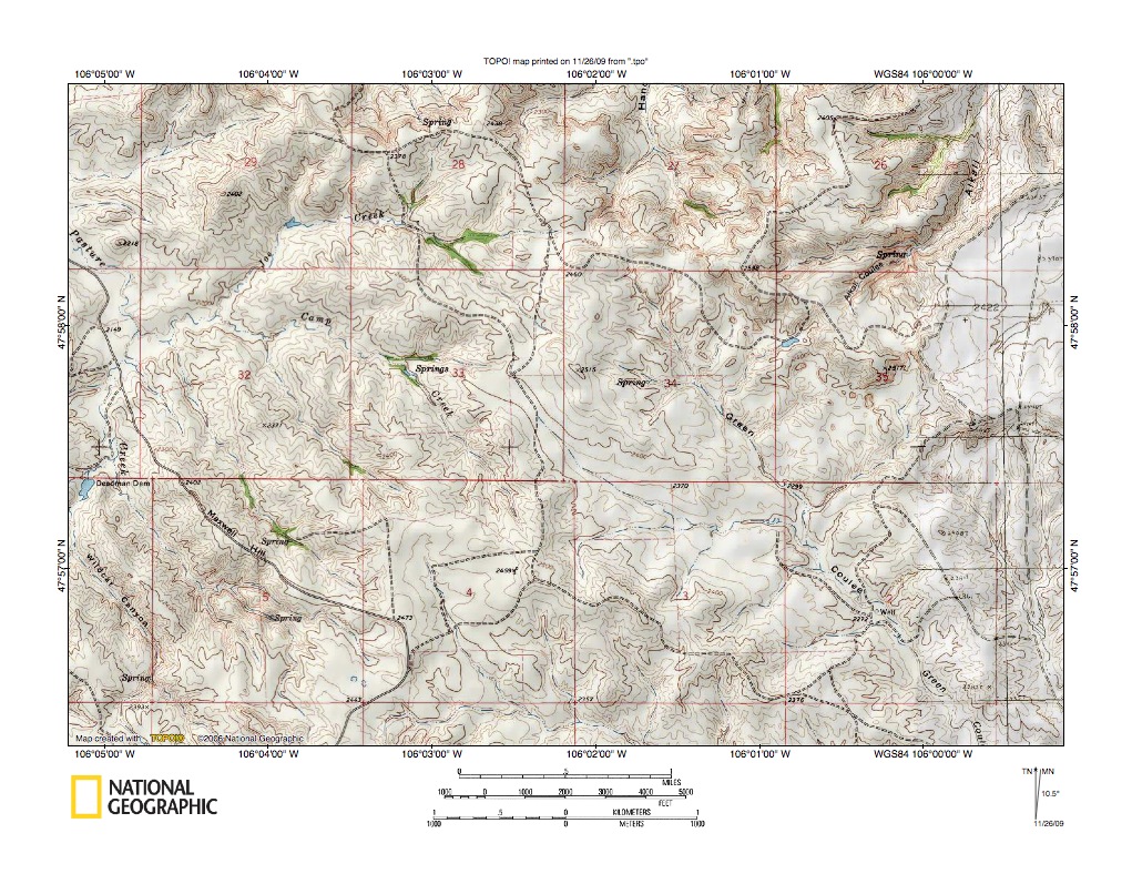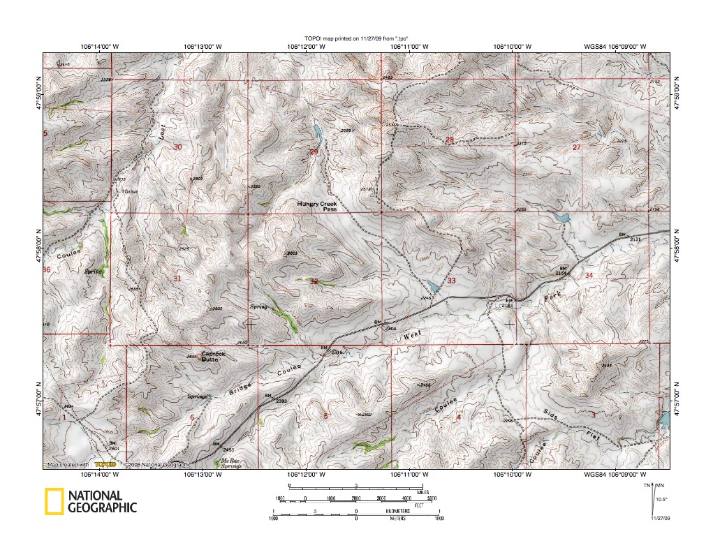 Figure 3a: detailed map Camp Creek-Green Coulee drainage divide area (see figure 3 discussion above). United States Geological Survey map digitally presented using National Geographic Society TOPO software.