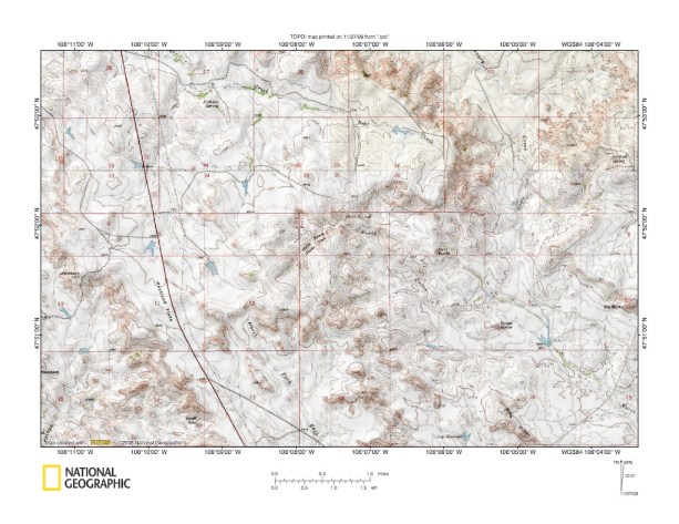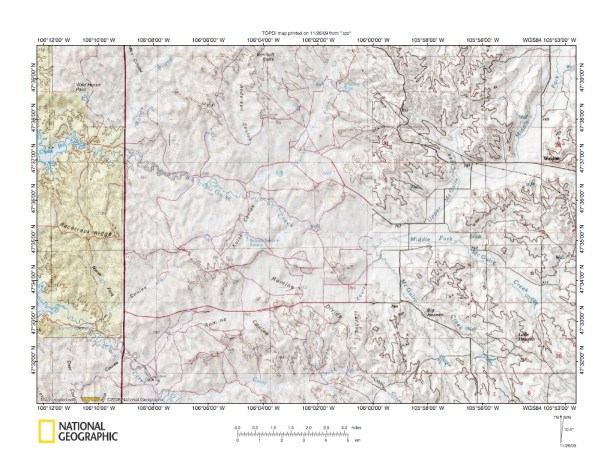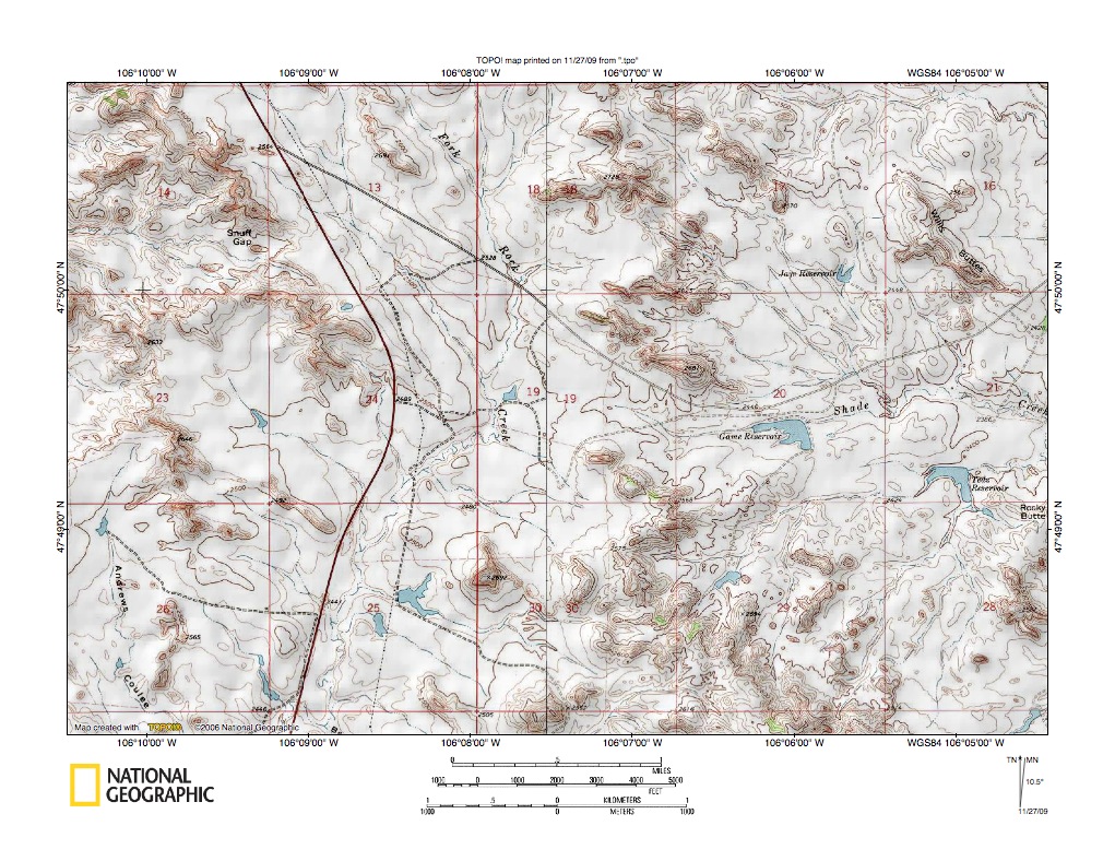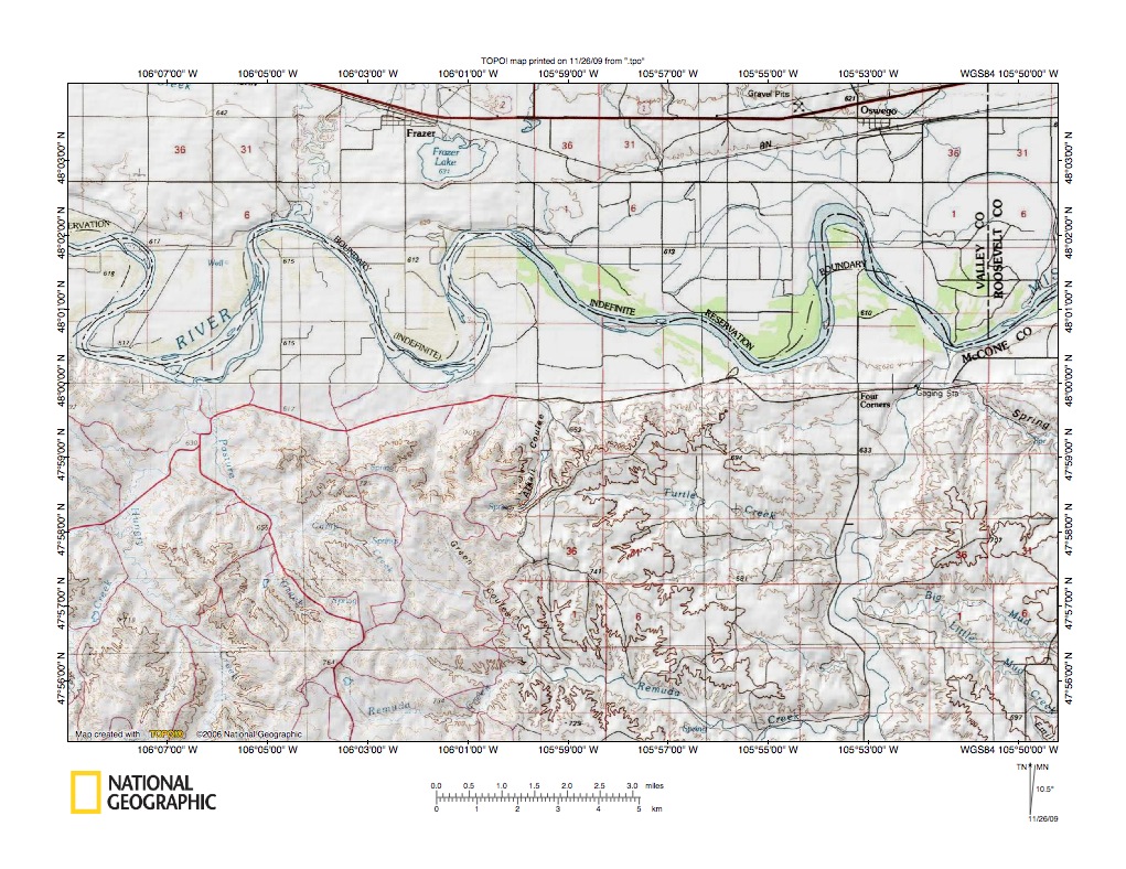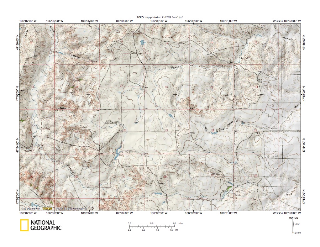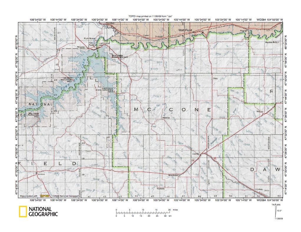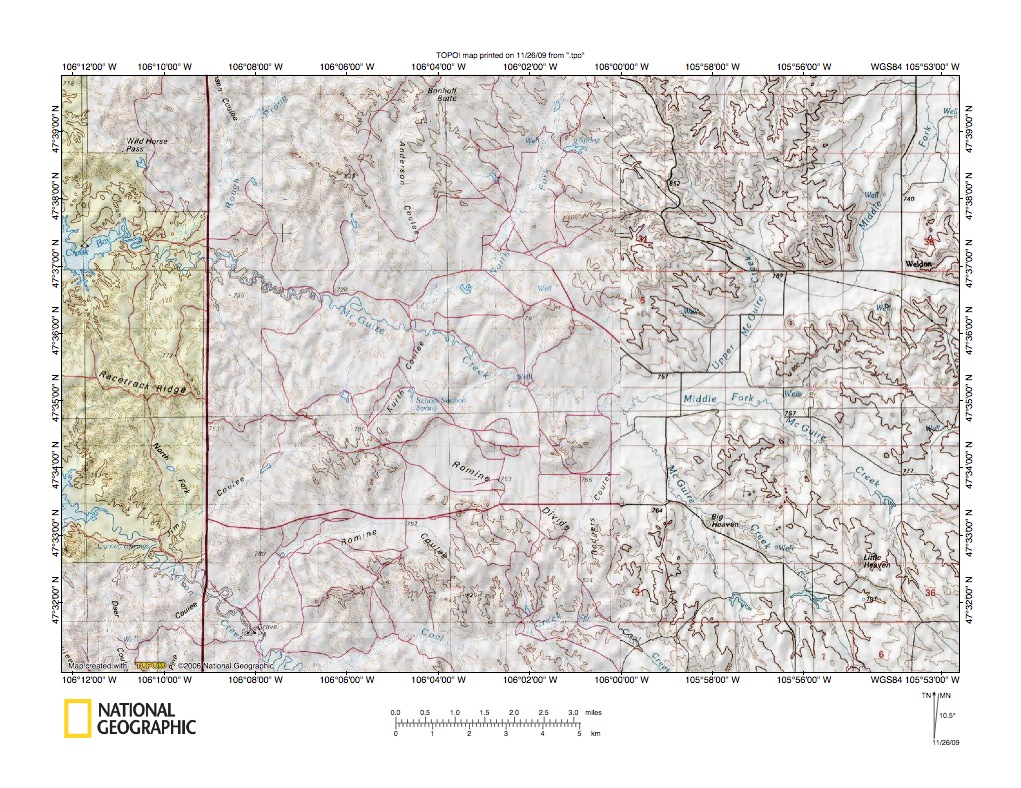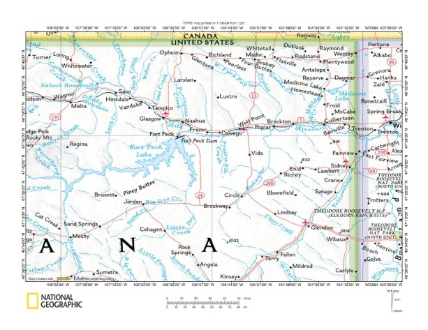 Figure 1: Big Dry Creek-Prairie Elk Creek and Big Dry Creek-Redwater River drainage divide area location map (select and click on maps to enlarge). National Geographic Society map digitally presented using National Geographic Society TOPO software.