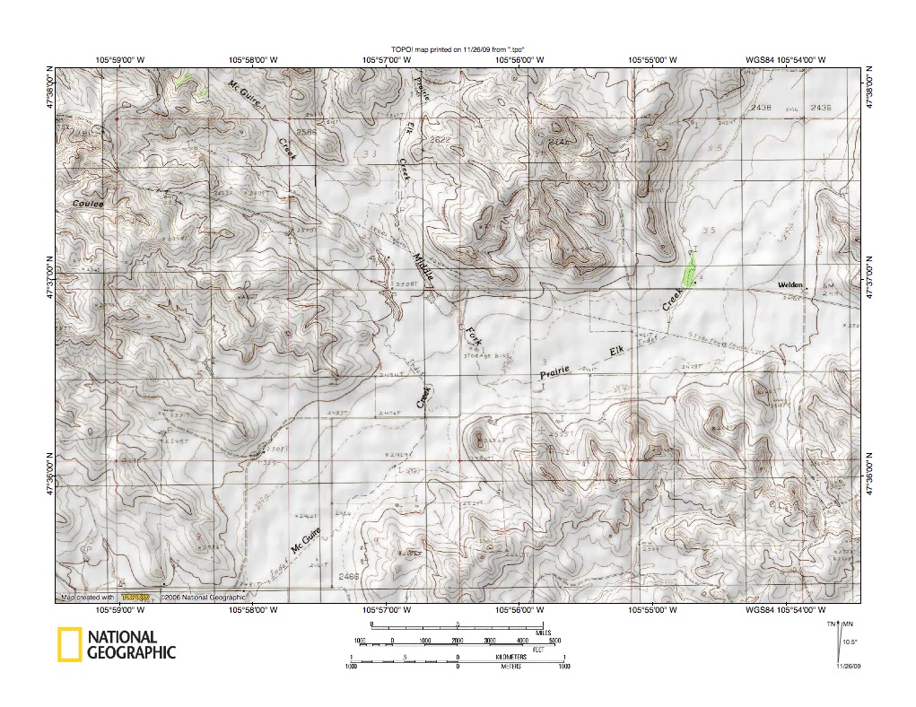 Figure 9: Detailed map of Upper McGuire Creek-Middle Fork Prairie Elk Creek drainage divide area. United States Geological Survey map digitally presented using National Geographic Society TOPO software.