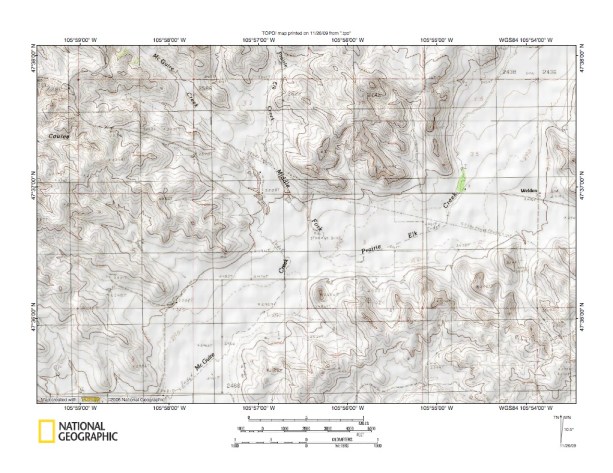 Figure 2: Big Dry Creek-Prairie Elk Creek and Big Dry Creek-Redwater River drainage divide area detailed location map. United States Geological Survey map digitally presented using National Geographic Society TOPO software.