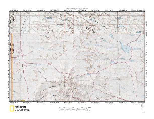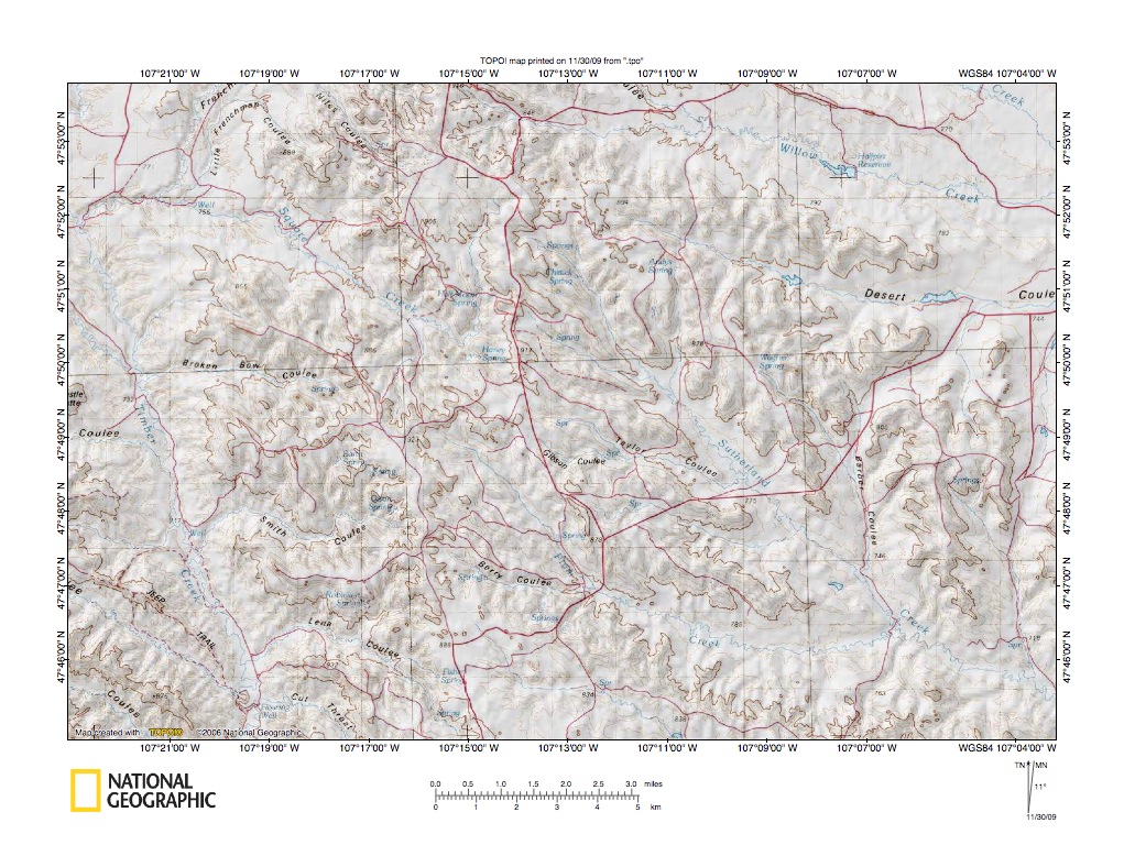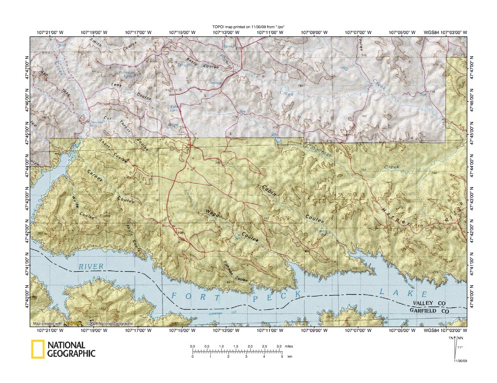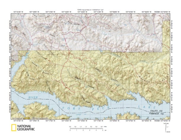 Figure 10: Timber Creek-Missouri River drainage divide area. United States Geological Survey map digitally presented using National Geographic Society TOPO software.