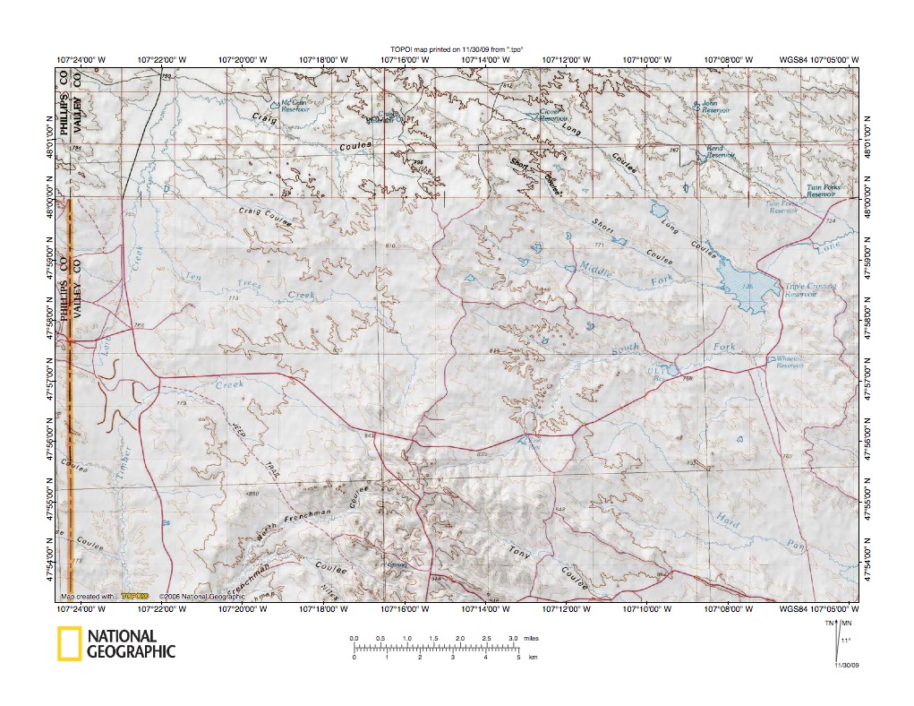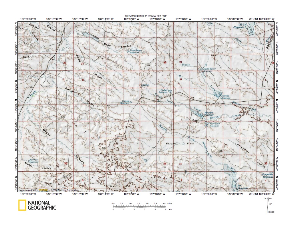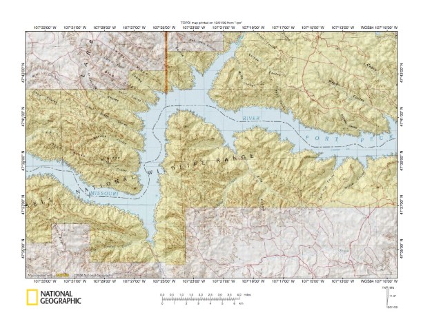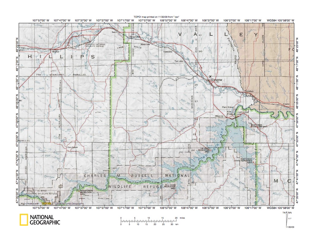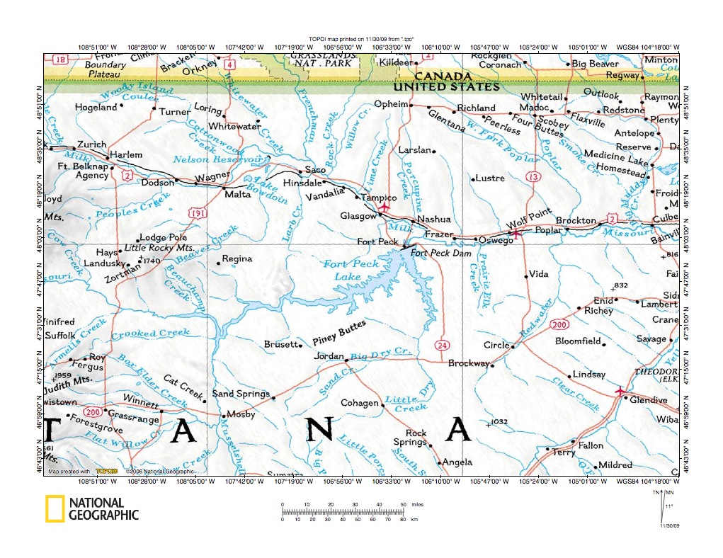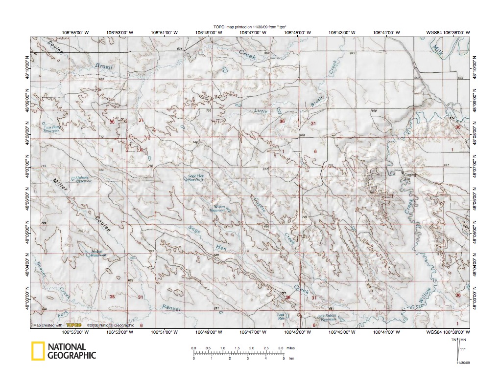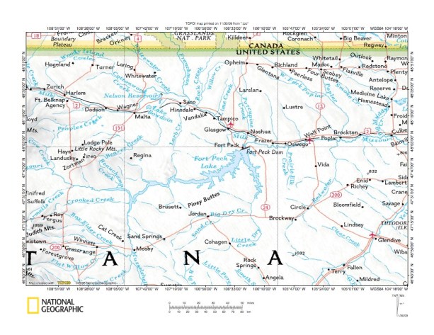 Figure 1: Milk River-Missouri River drainage divide area east of Larb Creek location map (select and click on maps to enlarge). National Geographic Society map digitally presented using National Geographic Society TOPO software.