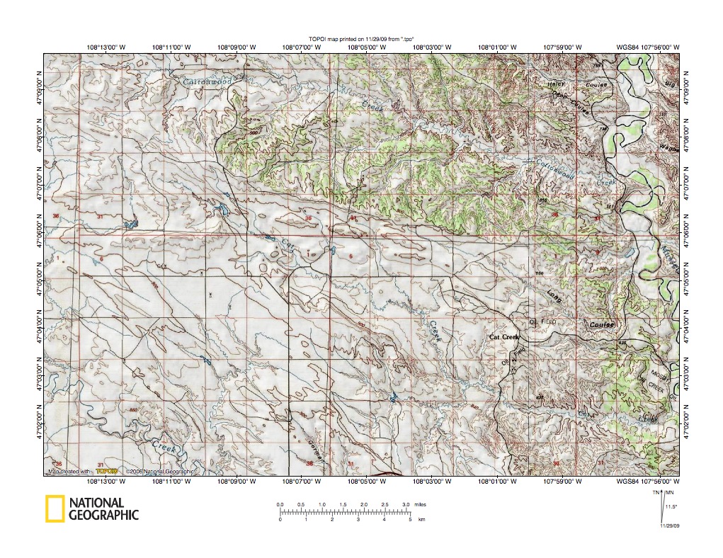 Figure 10: Cottonwood Creek-Cat Creek drainage divide area. United States Geological Survey map digitally presented using National Geographic Society TOPO software.