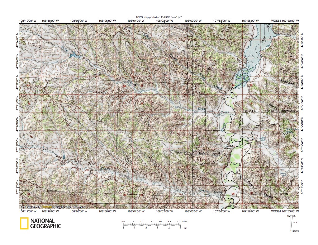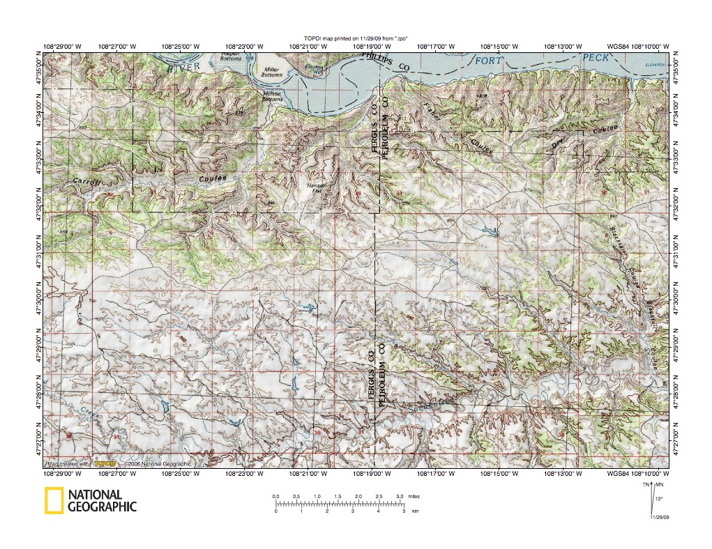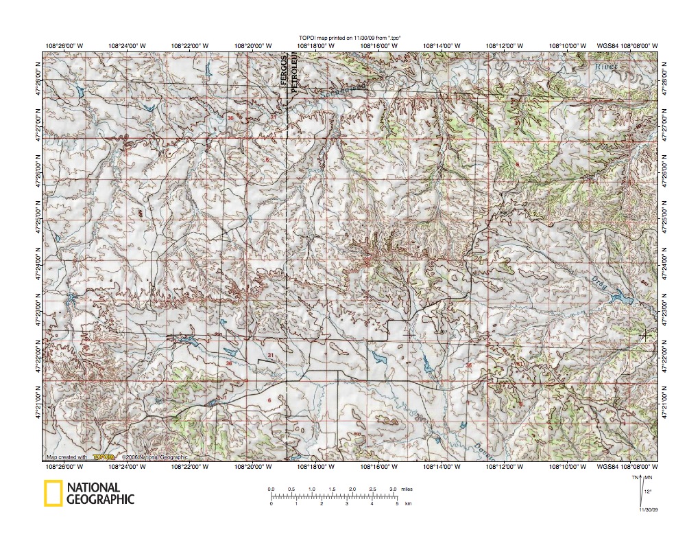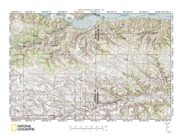 Figure 2: Missouri River-Musselshell River drainage divide area detailed location map. United States Geological Survey map digitally presented using National Geographic Society TOPO software.