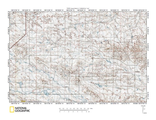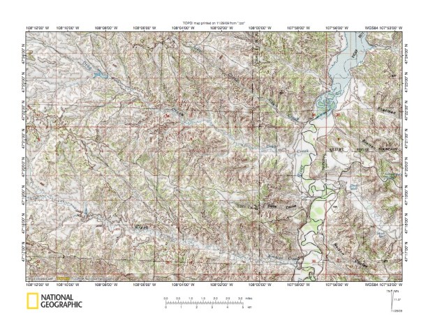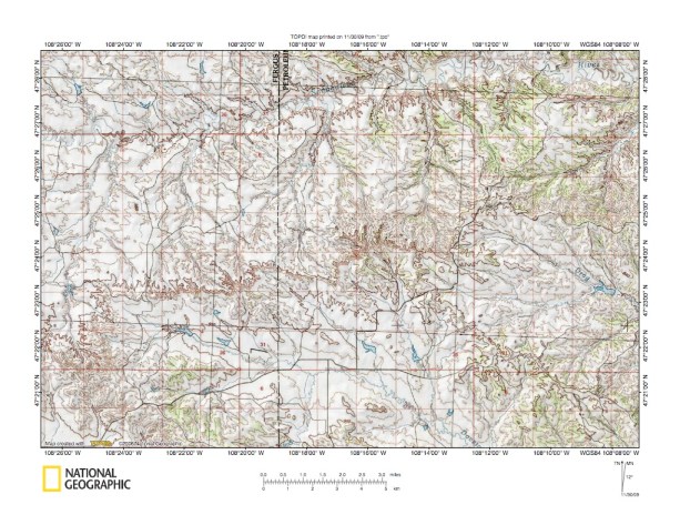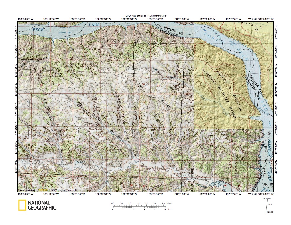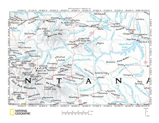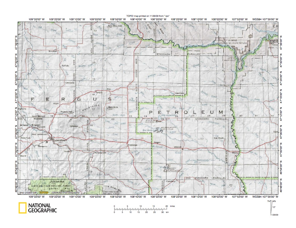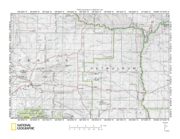 Figure 1: Missouri River-Musselshell River drainage divide area location map (select and click on maps to enlarge). National Geographic Society map digitally presented using National Geographic Society TOPO software.
