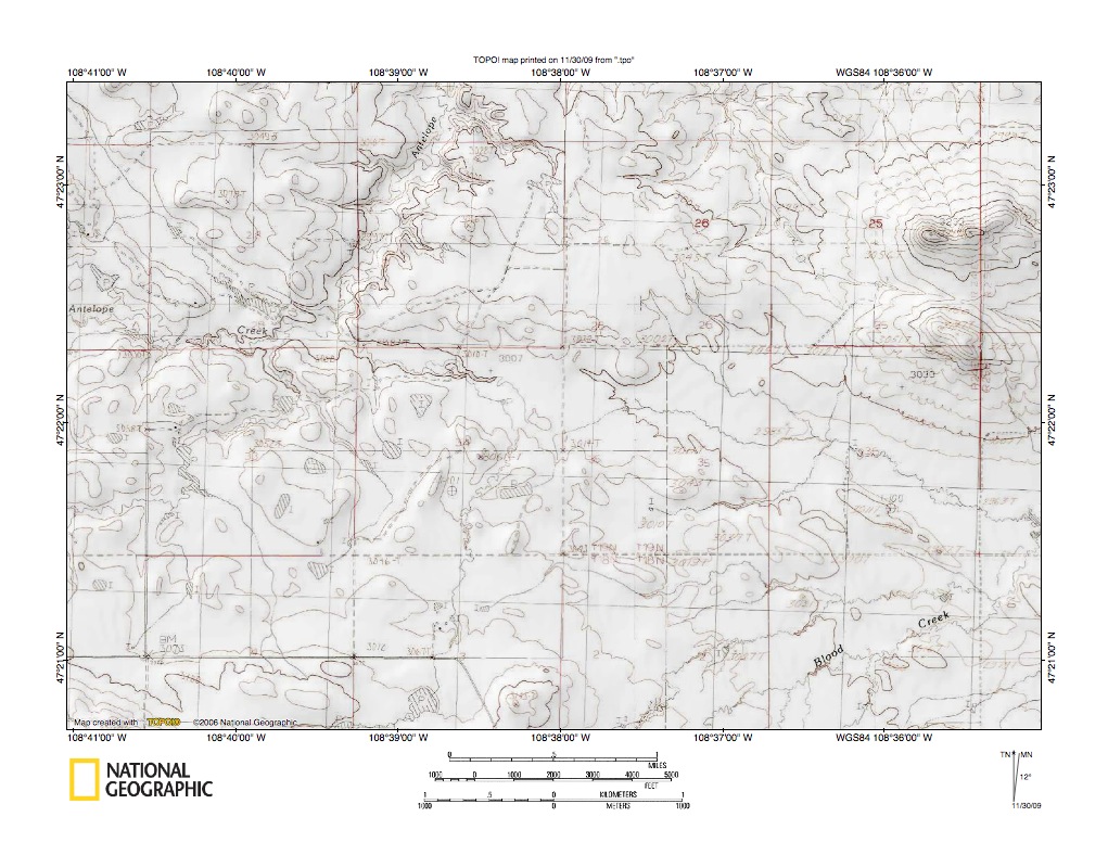 Figure 8: Antelope Creek-Blood Creek drainage divide area. United States Geological Survey map digitally presented using National Geographic Society TOPO software.