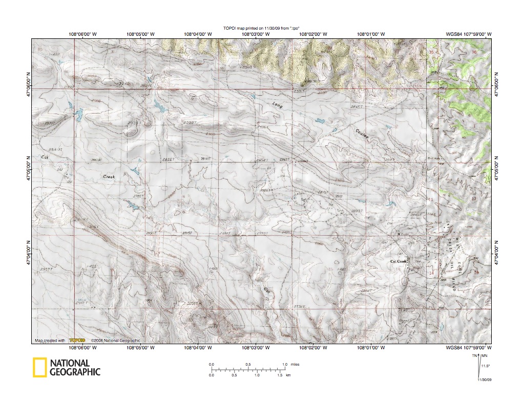 Figure 9: Blood Creek-Cottonwood Creek drainage divide area. United States Geological Survey map digitally presented using National Geographic Society TOPO software.
