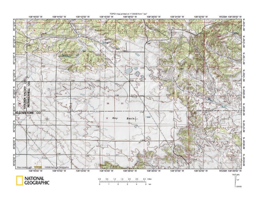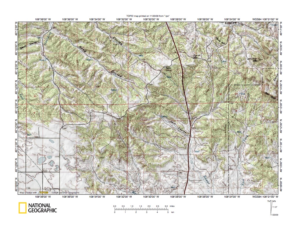 Figure 1: Musselshell River-Yellowstone River drainage divide area location map (select and click on maps to enlarge). National Geographic Society map digitally presented using National Geographic Society TOPO software.