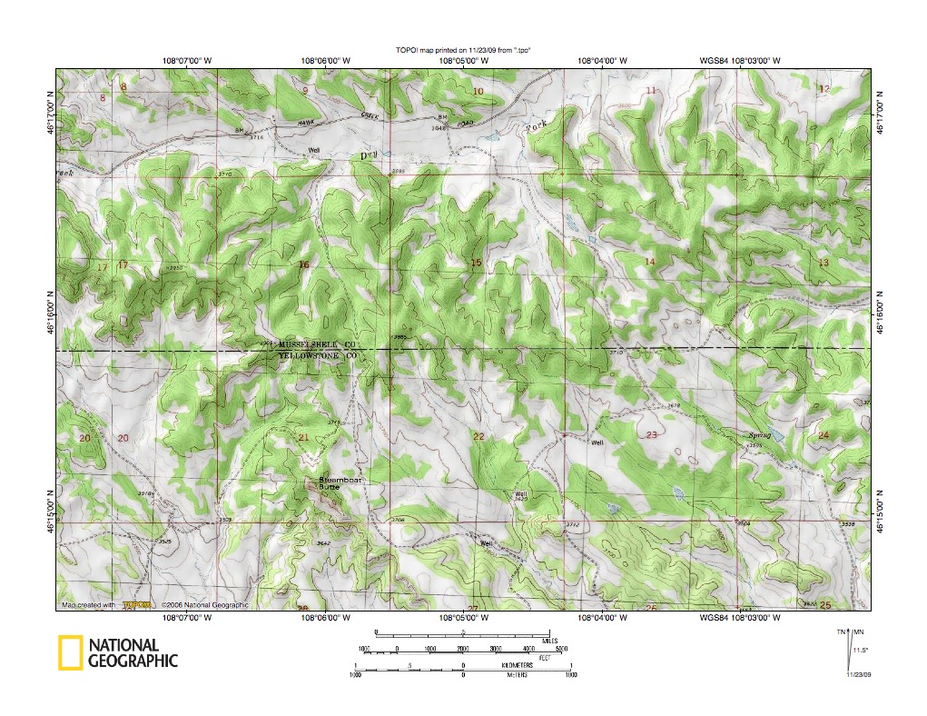 Figure 2: Musselshell River-Yellowstone River drainage divide area detailed location map. United States Geological Survey map digitally presented using National Geographic Society TOPO software.