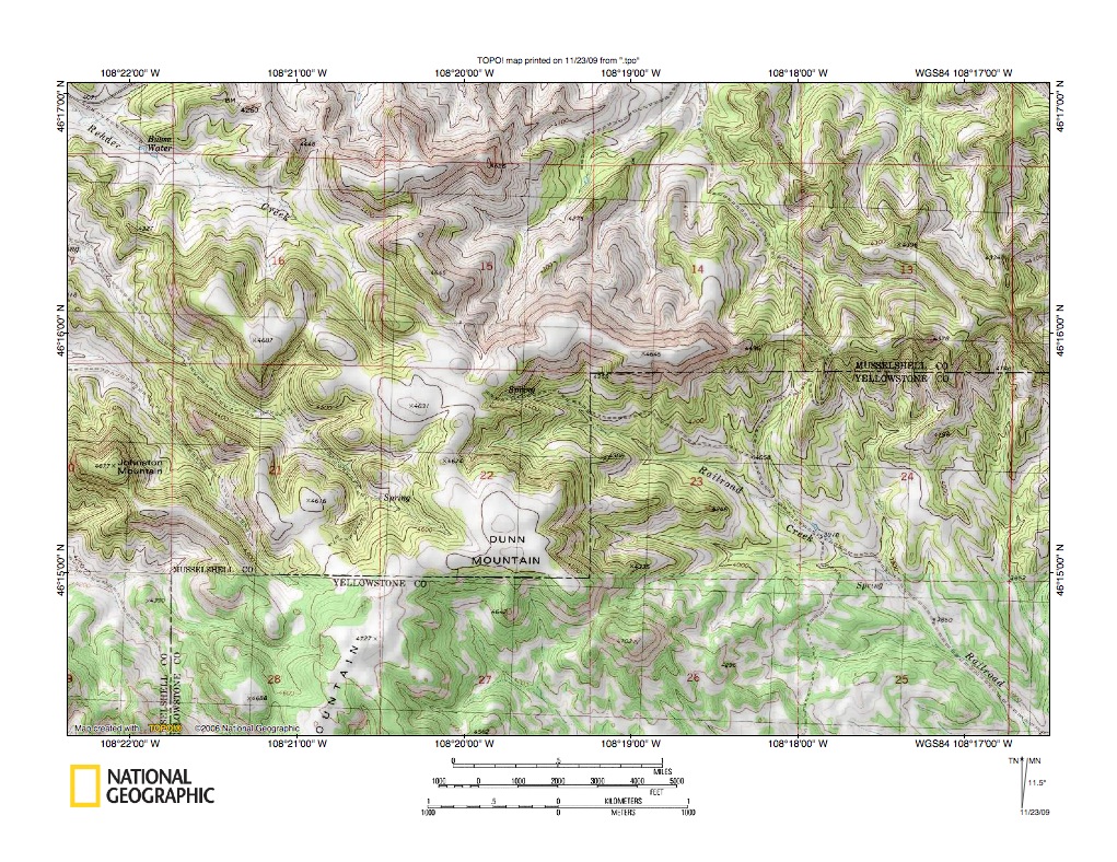 Figure 6: Halfbreed Creek-Railroad Creek drainage divide area near Dunn Mountain. United States Geological Survey map digitally presented using National Geographic Society TOPO software.