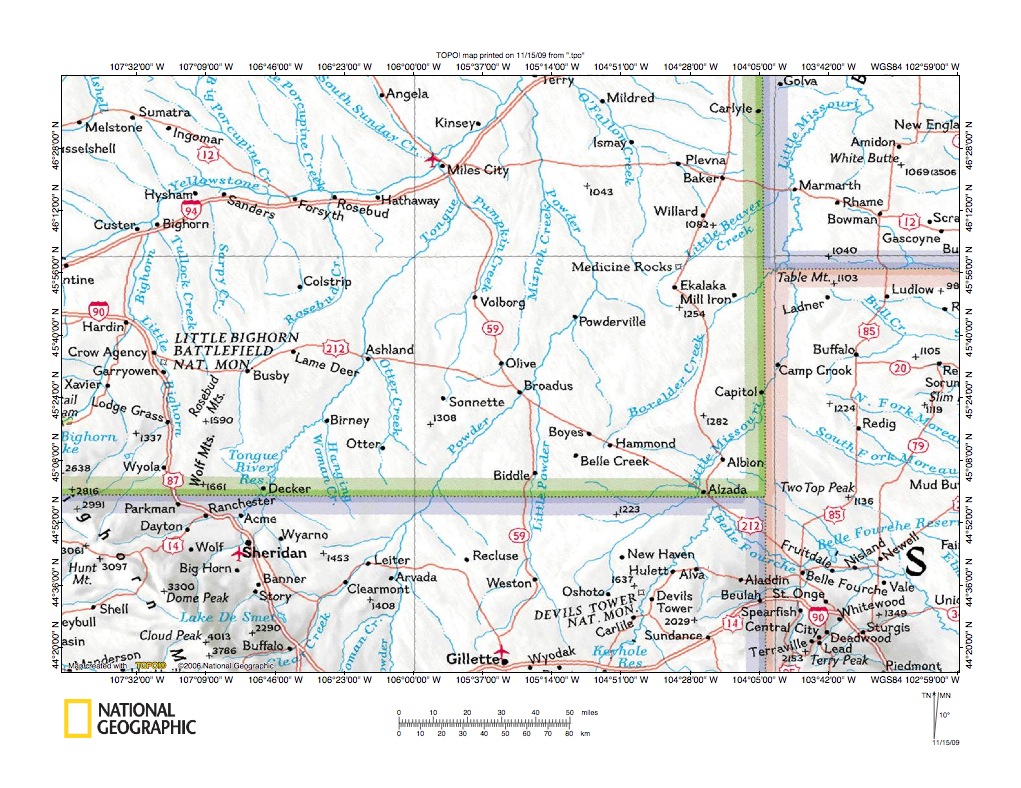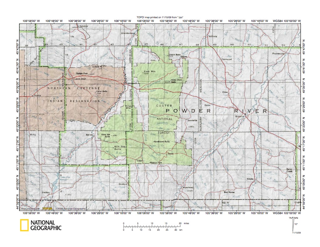 Figure 1: Otter Creek-Powder River drainage divide area location map (select and click on maps to enlarge). National Geographic Society map digitally presented using National Geographic Society TOPO software.