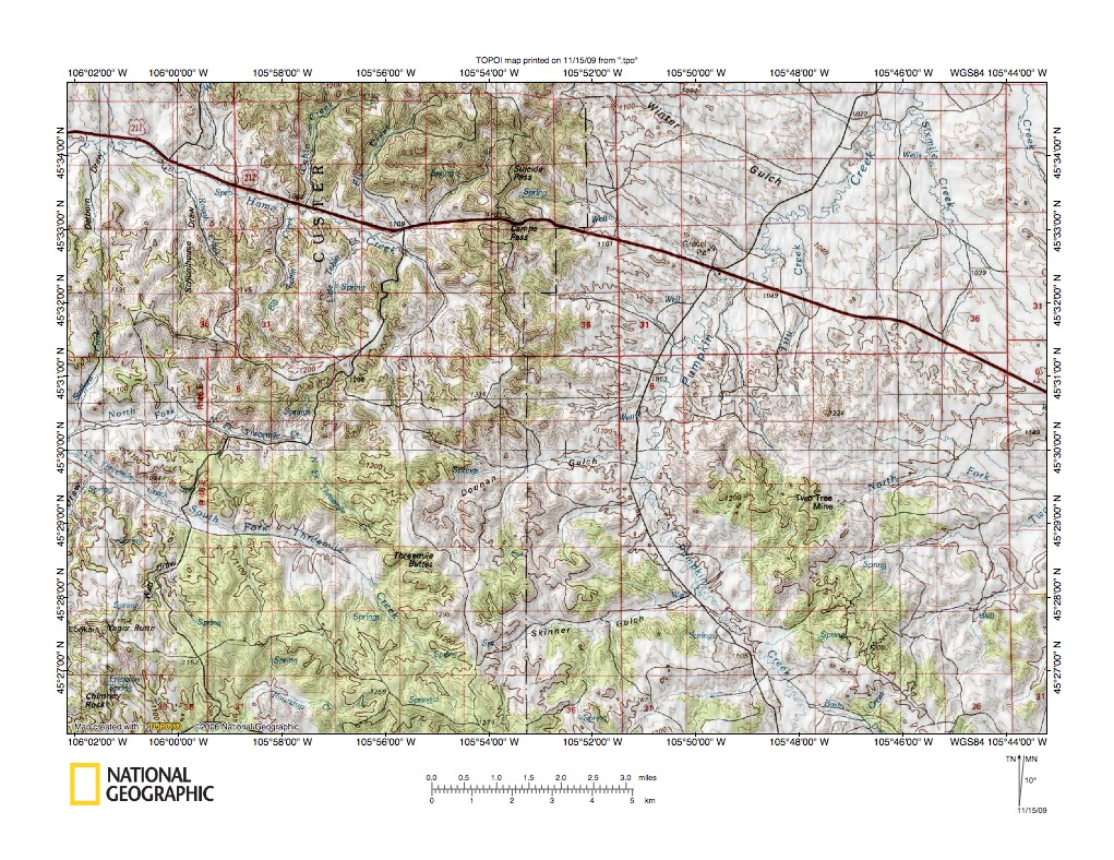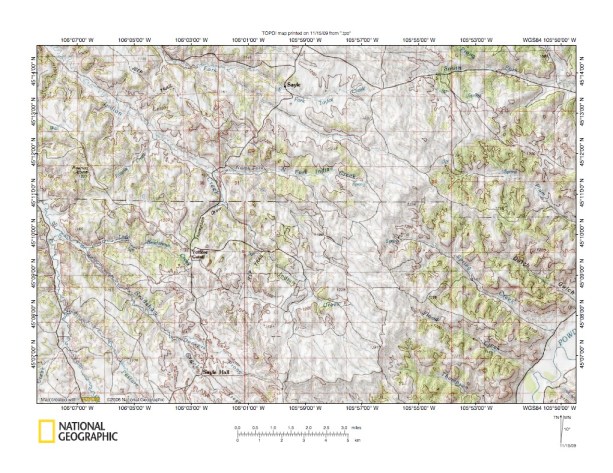 Figure 7: Indian Creek-Powder River drainage divide area. United States Geological Survey map digitally presented using National Geographic Society TOPO software.