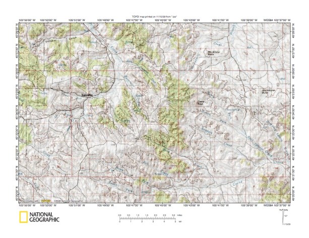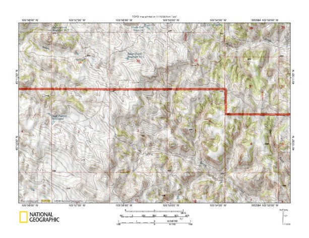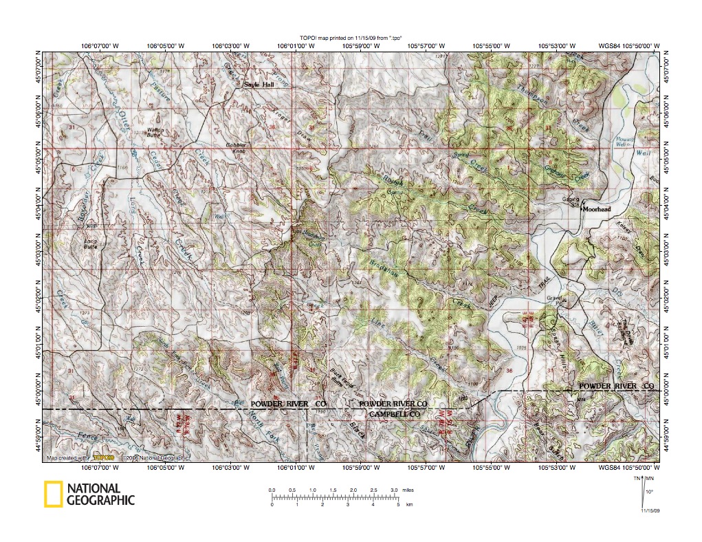 Figure 9: Otter Creek-Powder River drainage divide area near state line. United States Geological Survey map digitally presented using National Geographic Society TOPO software.
