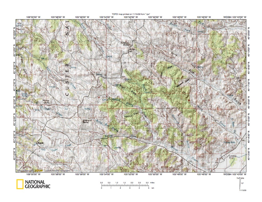 Figure 5: Otter Creek-Powder River drainage divide area near Diamond Butte. United States Geological Survey map digitally presented using National Geographic Society TOPO software.