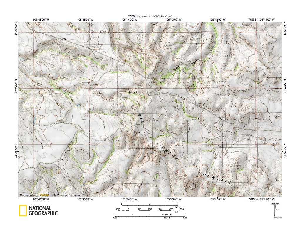 Figure 9: Redwater River-Yellowstone River drainage divide at Big Sheep Mountain. United States Geological Survey map digitally presented using National Geographic Society TOPO software.