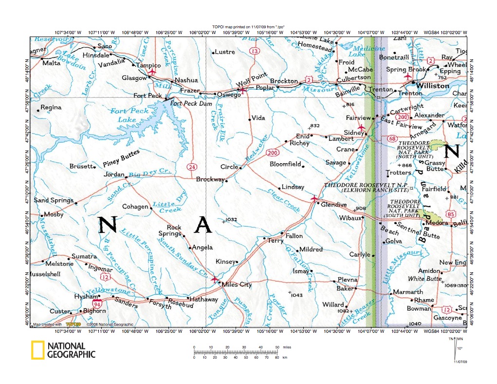 Figure 1: Redwater River-Yellowstone River drainage divide area location map (select and click on maps to enlarge). National Geographic Society map digitally presented using National Geographic Society TOPO software.