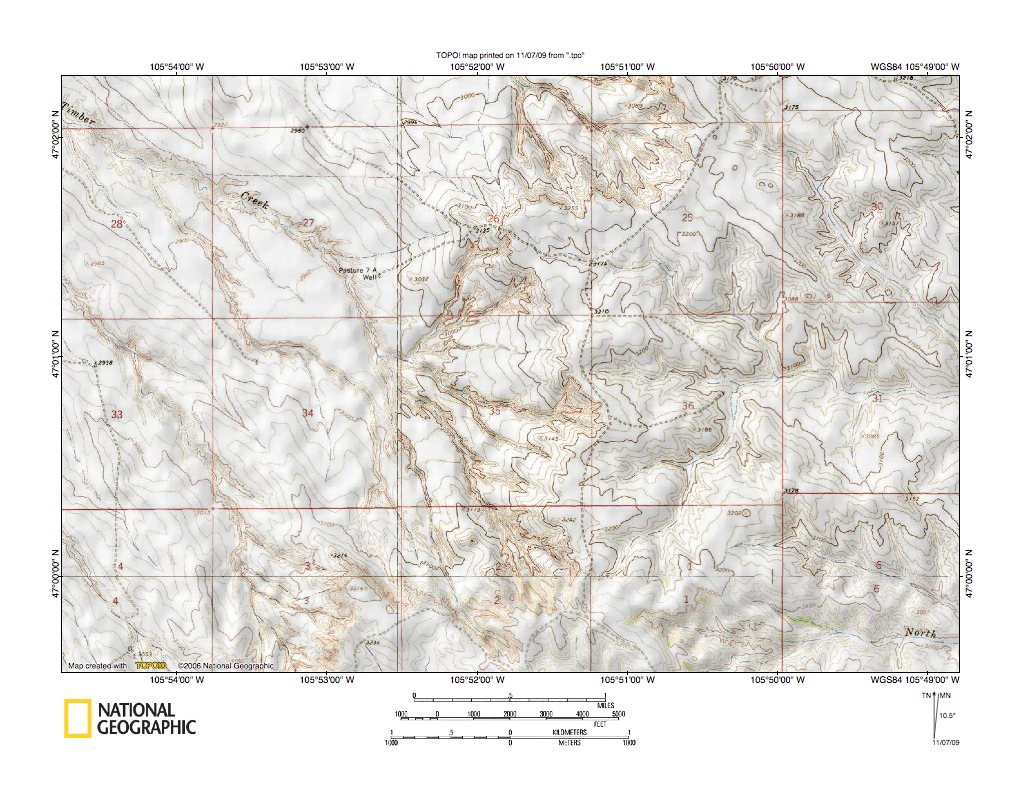 Figure 10: Timber Creek (Missouri River)-Cherry Creek (Yellowstone River) drainage divide. United States Geological Survey map digitally presented using National Geographic Society TOPO software.