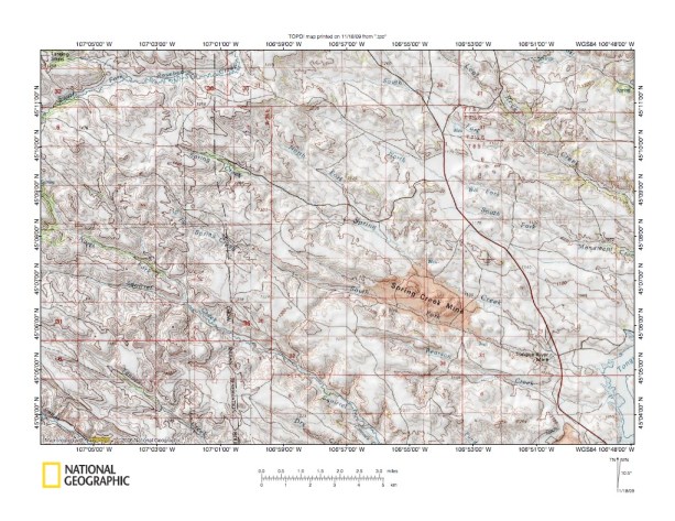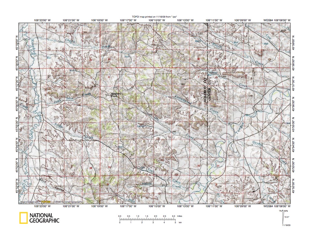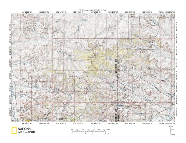 Figure 5: Rosebud Creek-Tongue River drainage divide area west of Brandenberg. United States Geological Survey map digitally presented using National Geographic Society TOPO software.
