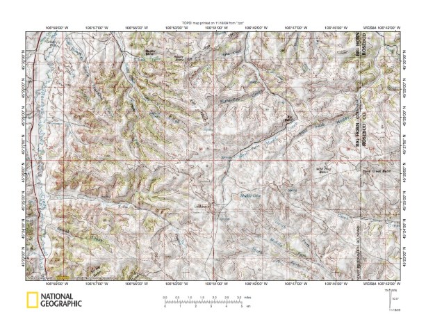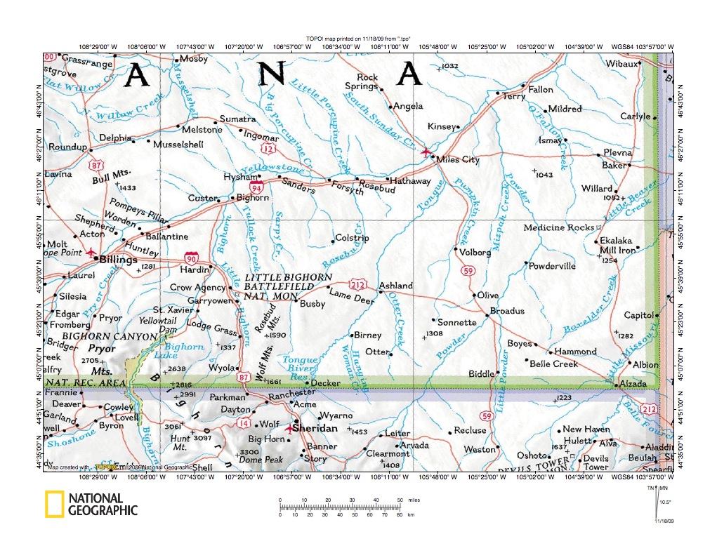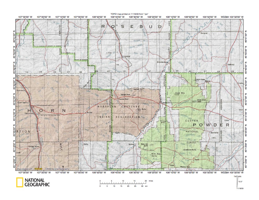 Figure 1: Rosebud Creek-Tongue River drainage divide area location map (select and click on maps to enlarge). National Geographic Society map digitally presented using National Geographic Society TOPO software.