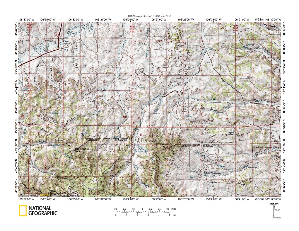 Figure 6: Rosebud Creek-Greenleaf Creek-Tongue River drainage divide area. United States Geological Survey map digitally presented using National Geographic Society TOPO software.