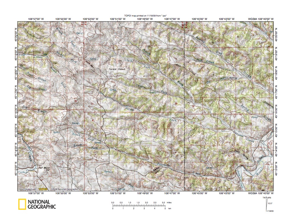 Figure 4: Rosebud Creek-Tongue River drainage divide area near Gobblers Knob. United States Geological Survey map digitally presented using National Geographic Society TOPO software.