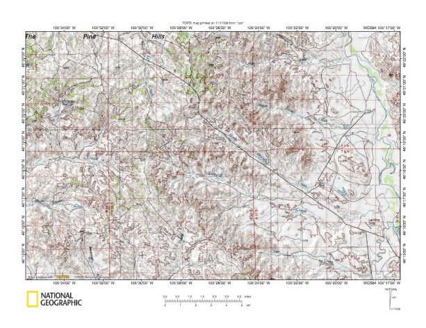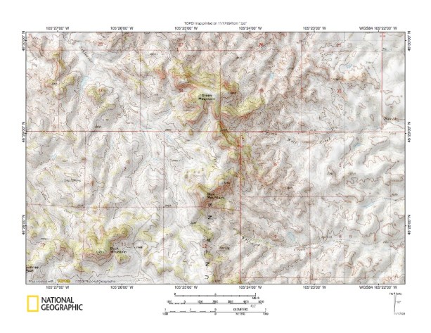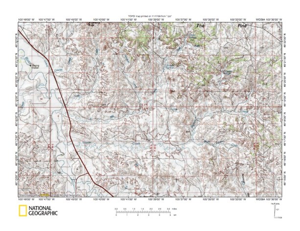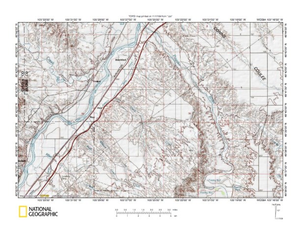 Figure 4: North end of Cottonwood Creek-Powder River drainage divide area. United States Geological Survey map digitally presented using National Geographic Society TOPO software.