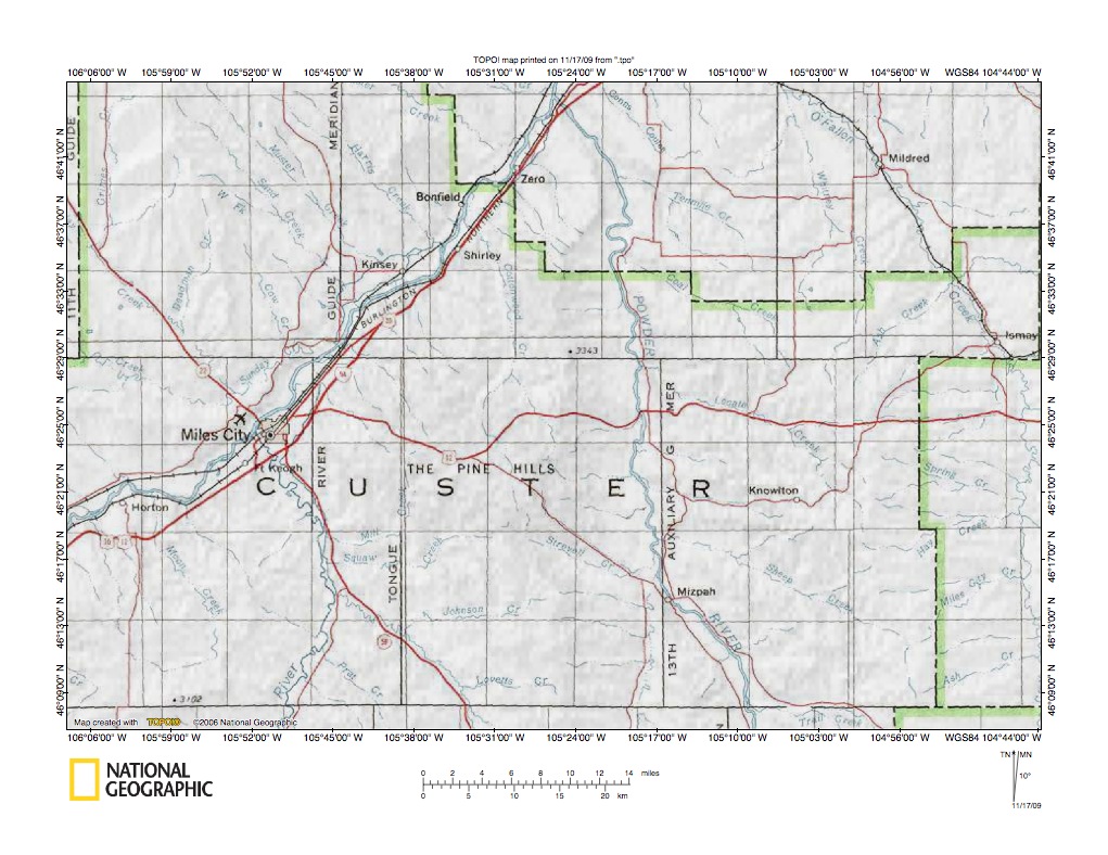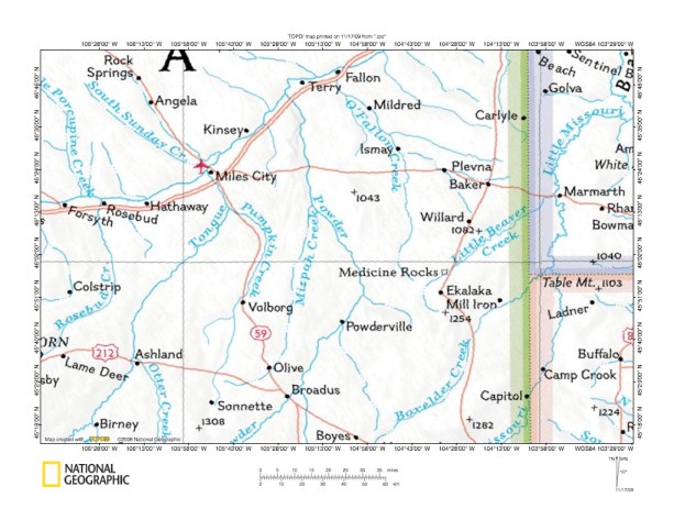 Figure 1: Yellowstone River (and Tongue River)-Powder River drainage divide area location map (select and click on maps to enlarge). National Geographic Society map digitally presented using National Geographic Society TOPO software.
