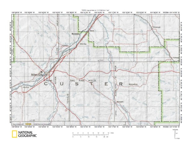 Figure 2: Yellowstone River (and Tongue River)-Powder River drainage divide area detailed location map. United States Geological Survey map digitally presented using National Geographic Society TOPO software.